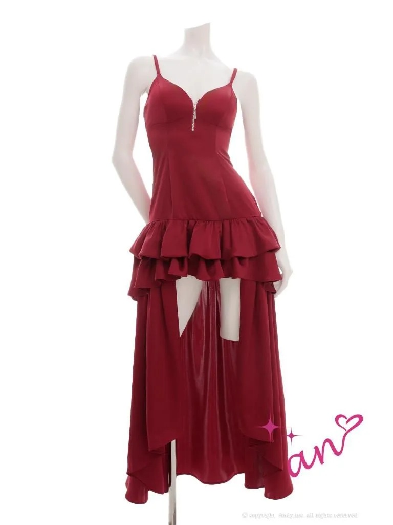 XSサイズあり【an /アン】 バストジップ/ チャーム付き/ キャミソール/ ティアードフリル/ フレア/ テールカット/ ロングドレス/ キャバドレス[OF05]