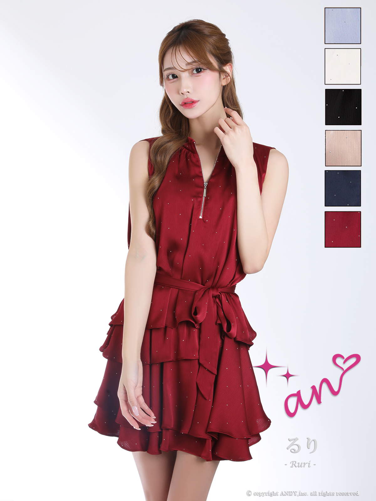 XSサイズあり【an /アン】ハイネック/ バストジップ/ ノースリーブ/ リボンベルト/ ティアード/ フリル/ フレア/ ラインストーン/ ミニドレス/ キャバドレス[OF05] [AOC3946-WR-S251222]