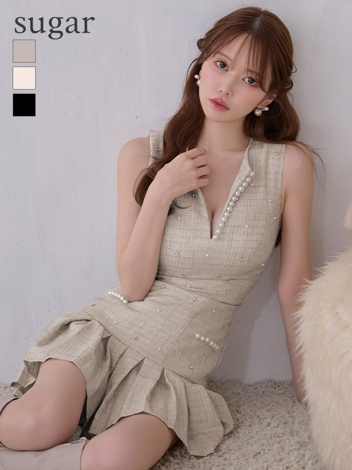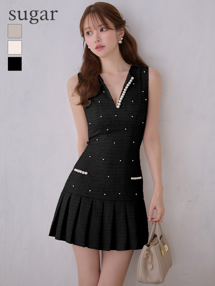 【JOLIESSE/ジョリエス】Vネック/ 銀糸/ チェック/ パール/ビジュー/ プリーツ/ フレア/ ミニドレス/ キャバドレス[HC03] [A-0351-GY-S251223]