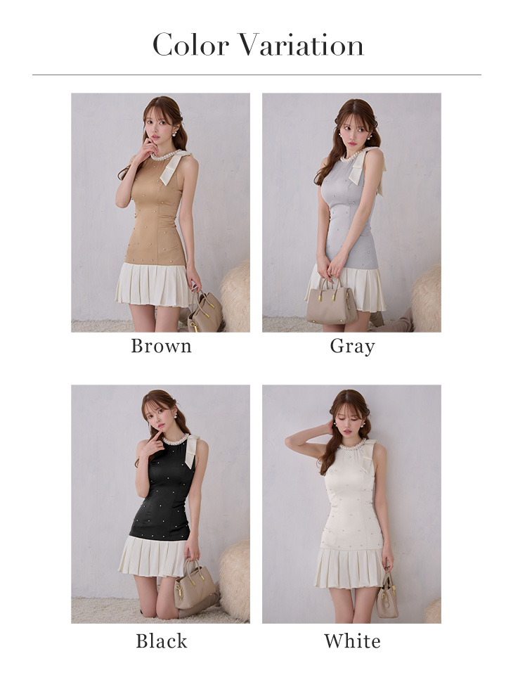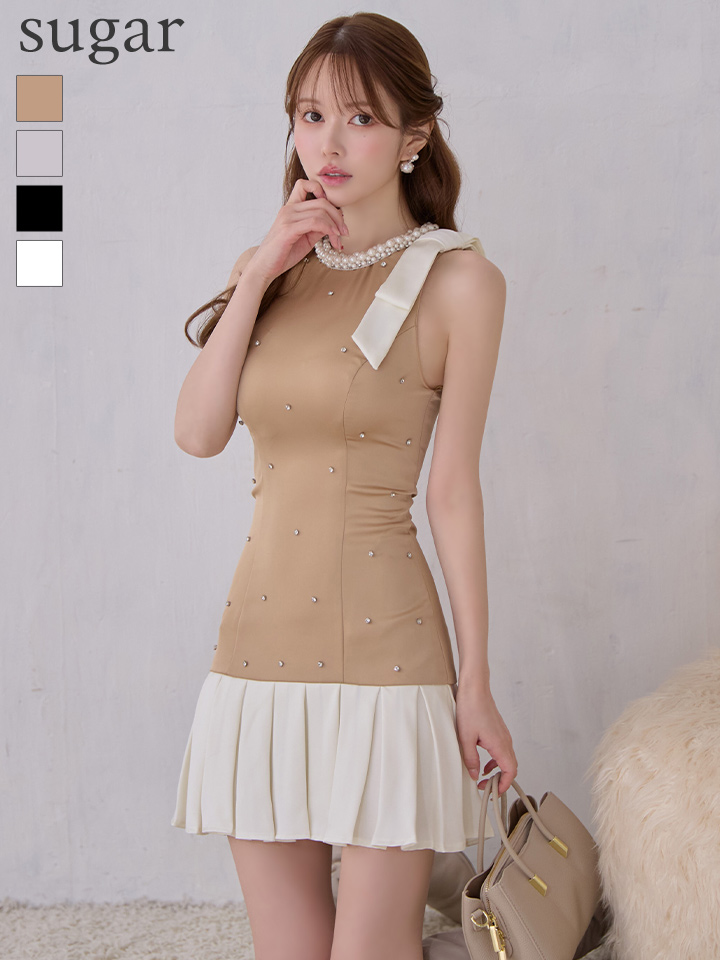 【JOLIESSE/ジョリエス】ショルダーリボン/ ネックパール/ ビジュー/ サテン/ ノースリーブ/ フレア/ ミニドレス/ キャバドレス[HC03] [A-0353-BR-S251223]