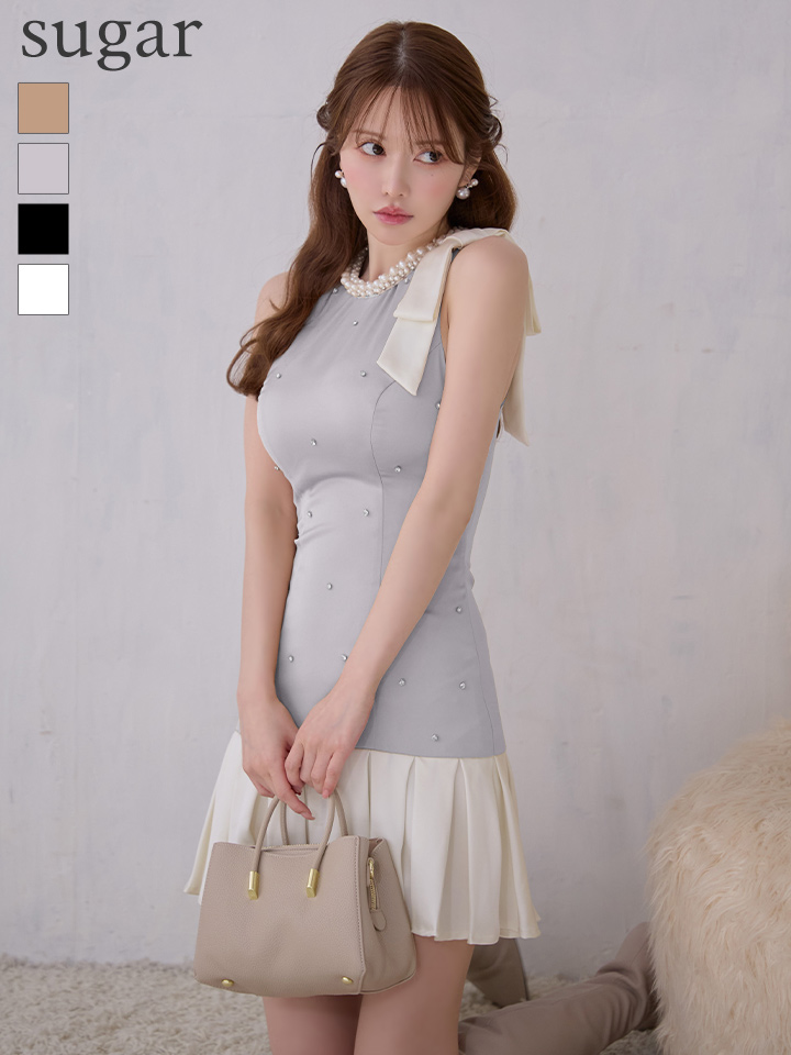 - > 【JOLIESSE/ジョリエス】ショルダーリボン/ ネックパール/ ビジュー/ サテン/ ノースリーブ/ フレア/ ミニドレス/ キャバドレス[HC03]