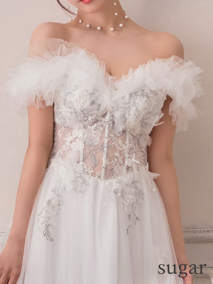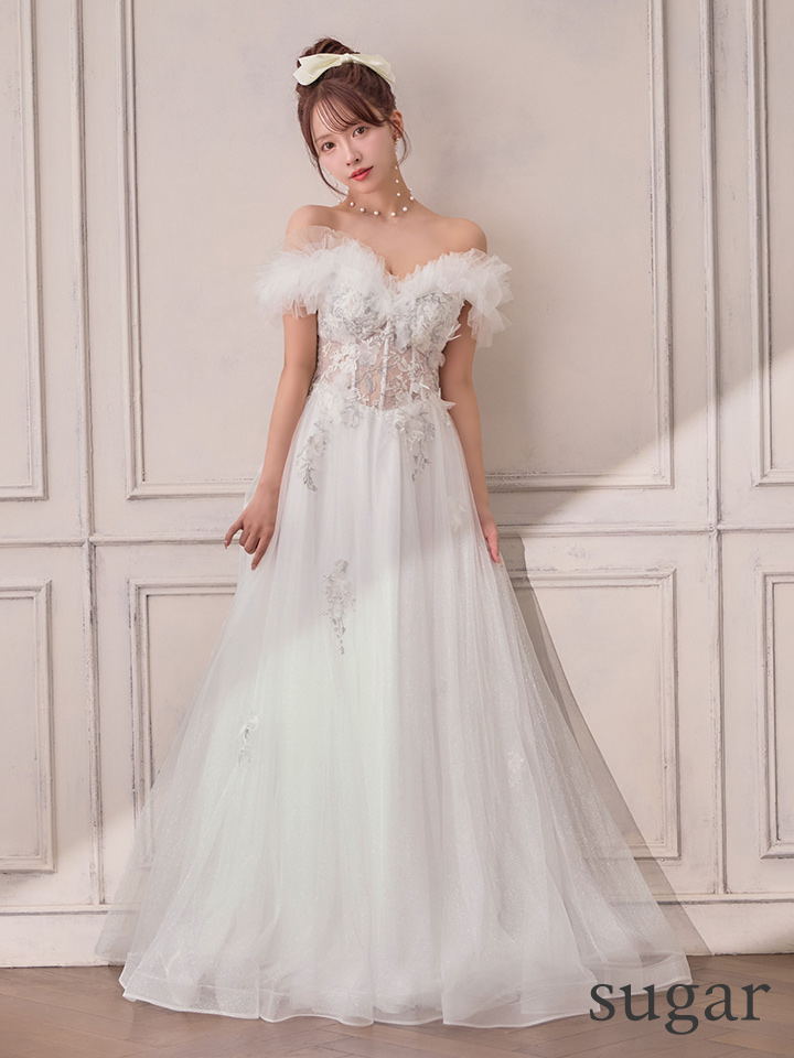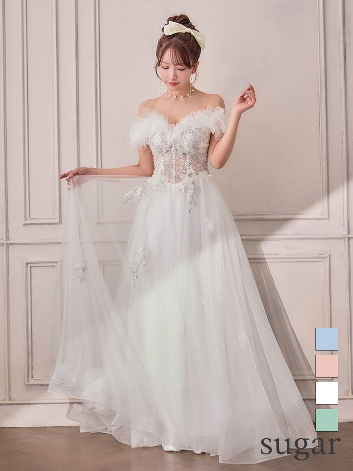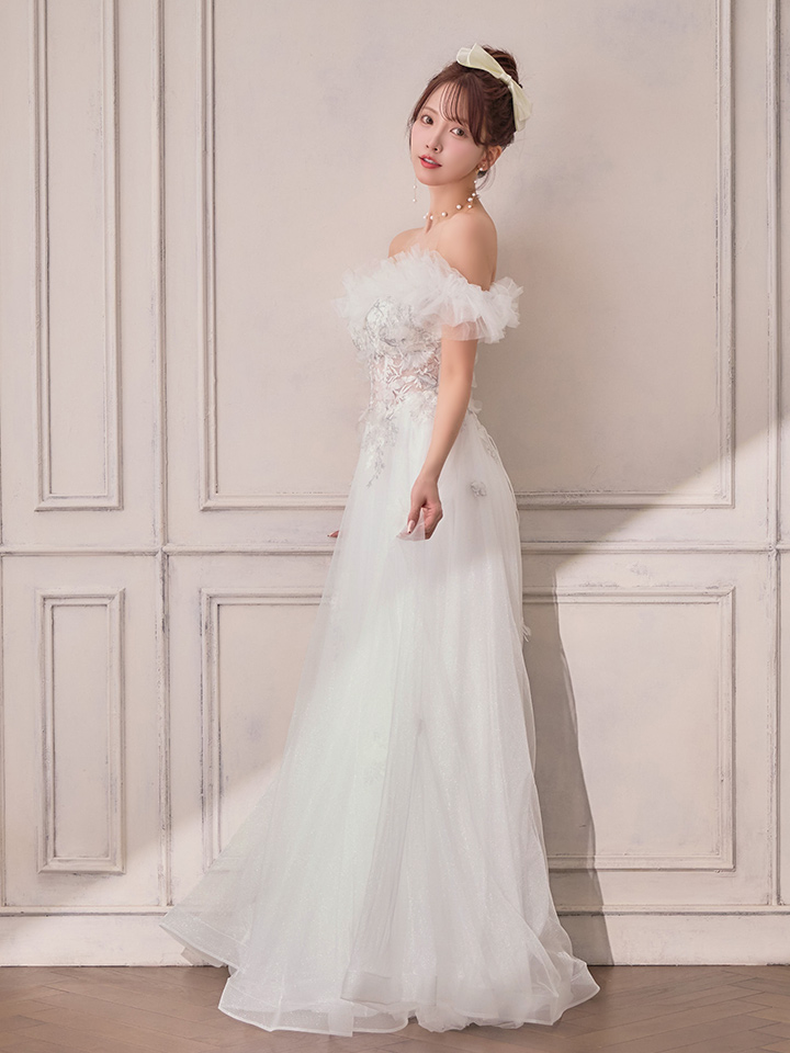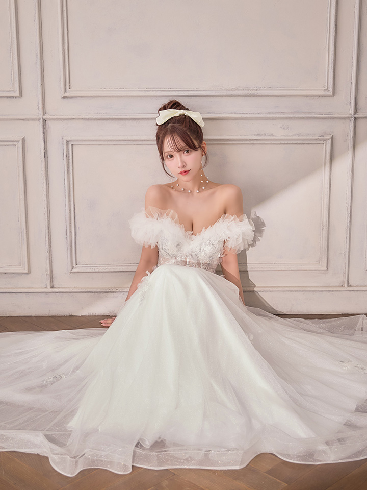 ボリューム感たっぷりのチュールフリルオフショルが華やかなプリンセスロングドレス♡