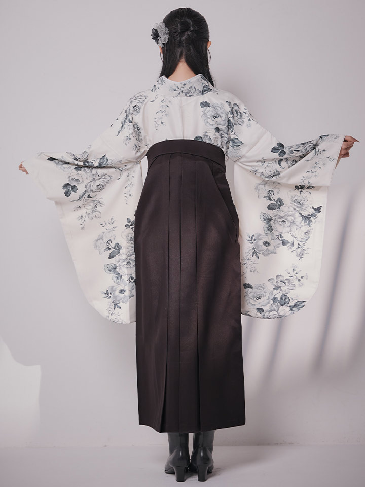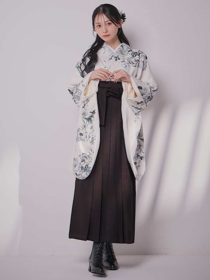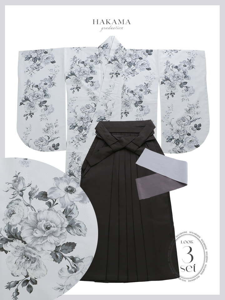 【予約商品 / 1月中旬発送予定】グレーフラワーブーケ ホワイト二尺袖着物【卒業袴3点セット 二尺袖着物/帯/袴】