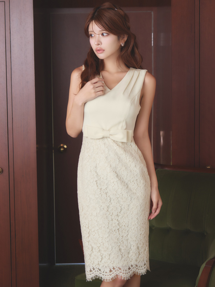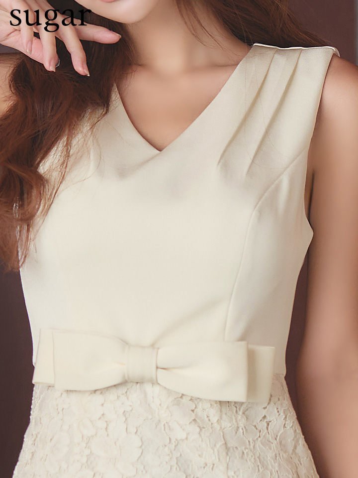XS-Lサイズあり【SETTAN/セッタン】フラワー刺繍/ レース/ ウエストリボン/ ノースリーブ/ Vネック/ 膝丈/ タイト/ ミディアムドレス/ キャバドレス[OF2] [LKS25021-IV-S2512]
