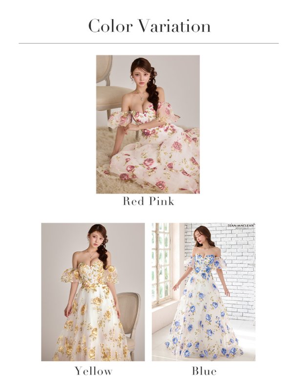 Lサイズあり【JEAN MACLEAN/ジャンマクレーン】フラワープリント/ オーガンジー/ ベア/ パフスリーブ/ 袖あり/ プリンセス/ Aライン/ ロングドレス / キャバドレス long[OF2A] [41593-JM-YE-S251225]