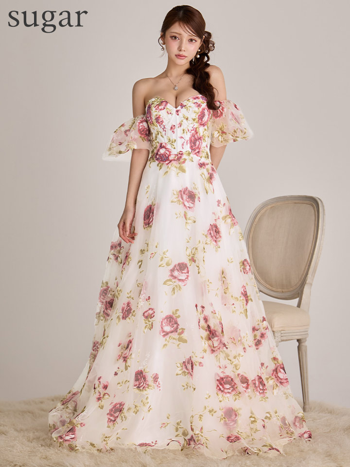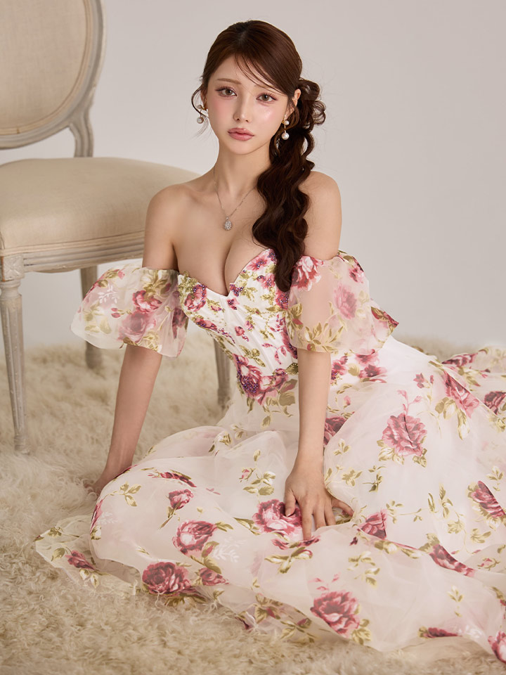 フェミニンなフラワープリントxふんわりとしたパフスリーブが目を引くプリンセスロングドレス♡