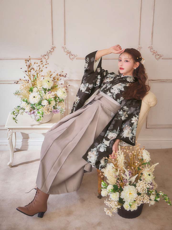 【予約商品/1月中旬発送】ベージュ小花 ブラウン二尺袖着物【卒業袴3点セット 二尺袖着物/帯/袴】