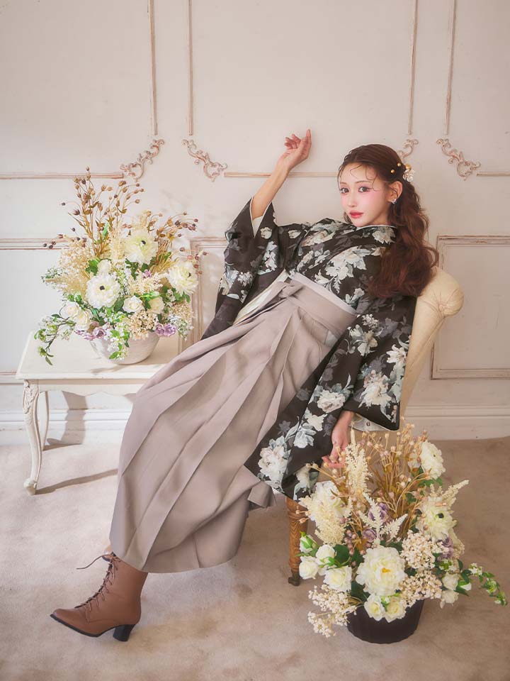 【予約商品/1月中旬発送】ベージュ小花 ブラウン二尺袖着物【卒業袴3点セット 二尺袖着物/帯/袴】 [HR-106-ok-BR-F-25AS-251229]