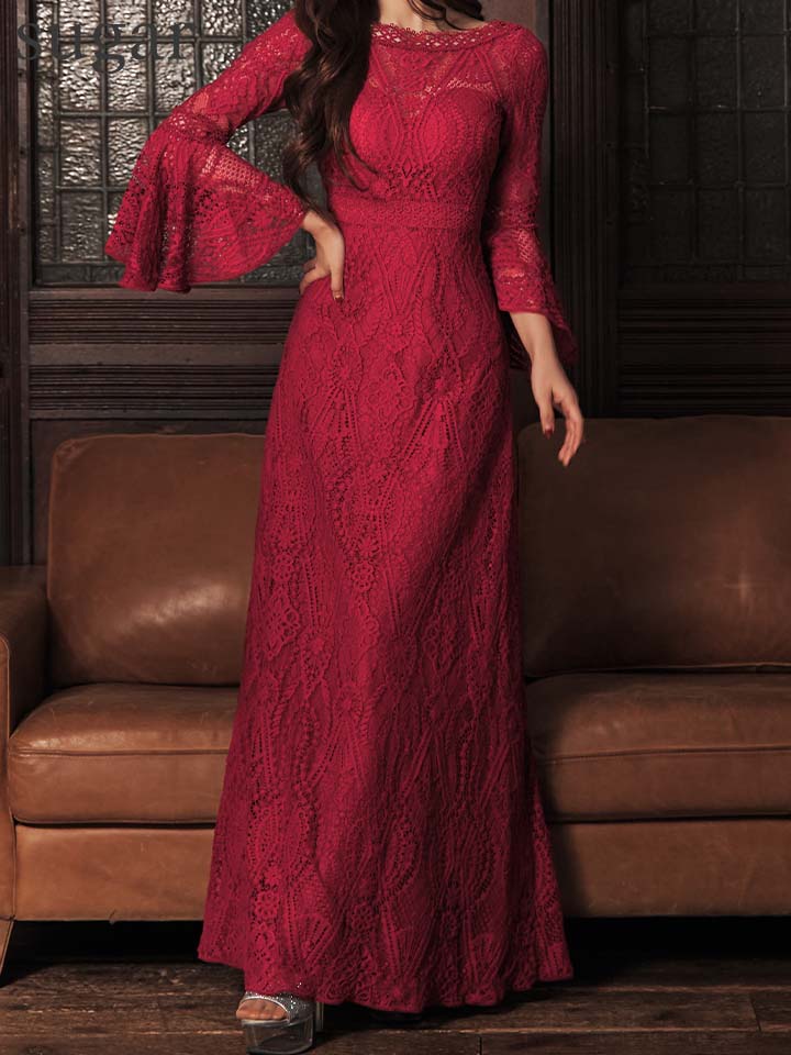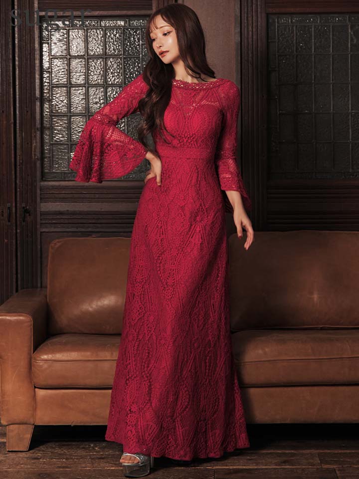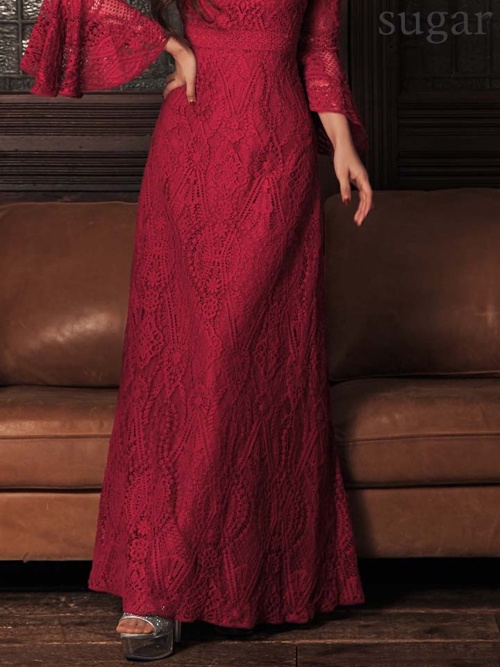 - > XS-Lサイズあり【ERUKEI エルケイ】 総レース/ ベルスリーブ/ Aライン/ エレガント/ ロングドレス/ キャバドレス[OF2]