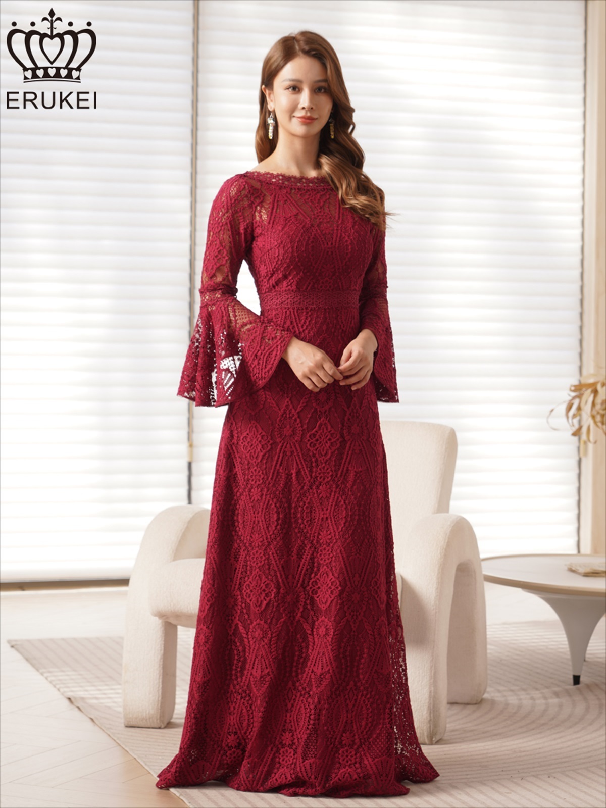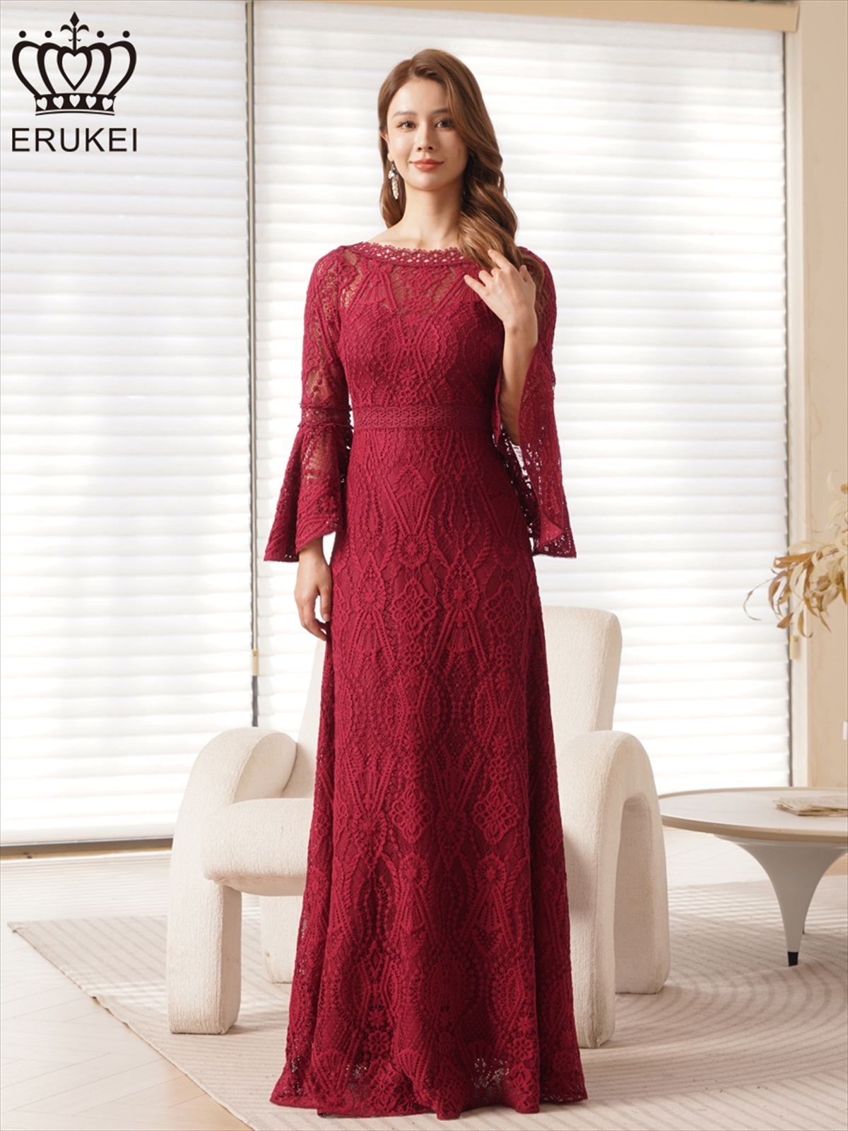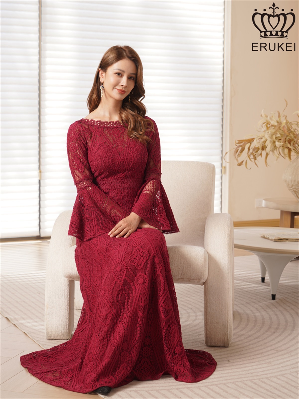 XS-Lサイズあり【ERUKEI エルケイ】 総レース/ ベルスリーブ/ Aライン/ エレガント/ ロングドレス/ キャバドレス[OF2] [LKE24083-WR-S2512]