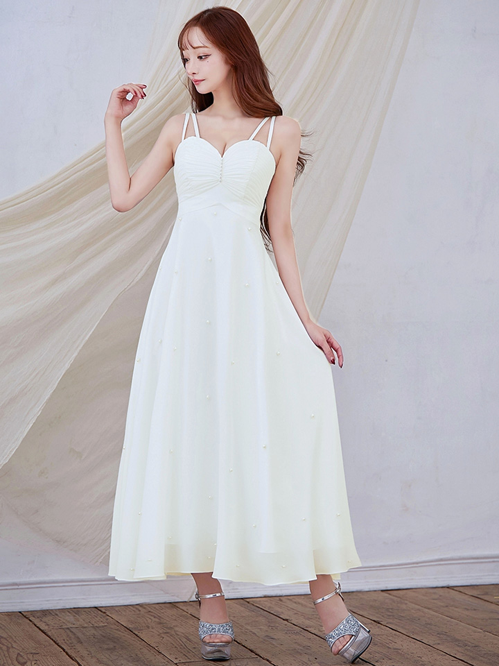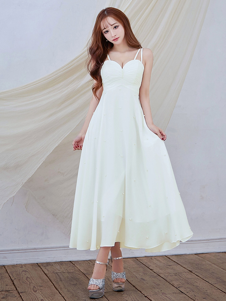 - > Lサイズあり【ISA FERRIS/ イサフェリス】【OF05】シンプル/ キャミソール/ パール/ フレア/ Aライン/ ミモレ丈/ ワンピース/ ミディアムドレス/ キャバドレス