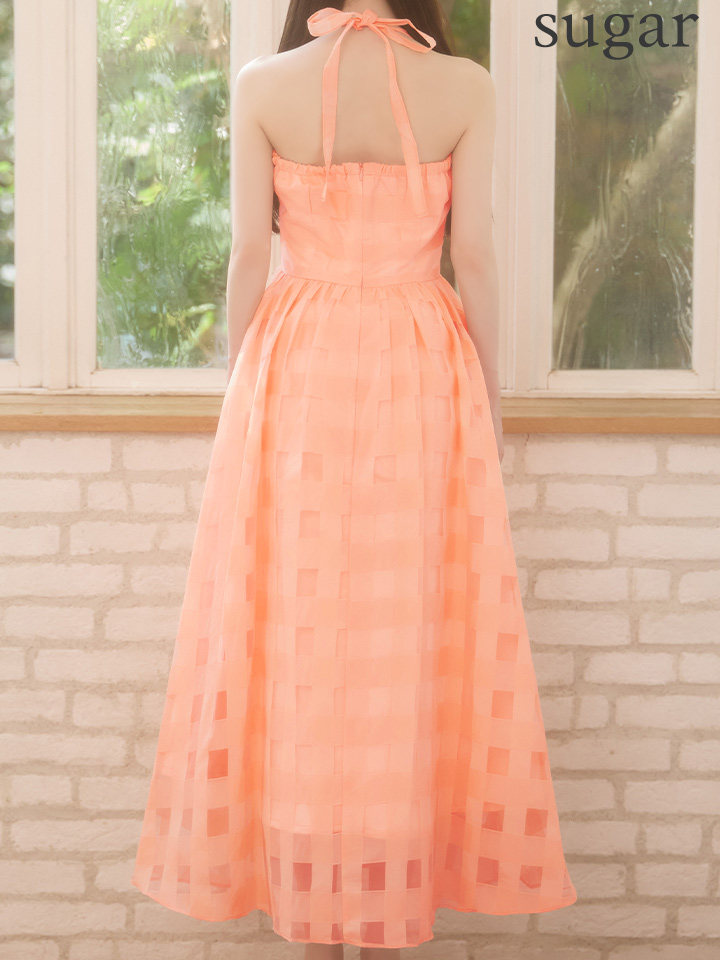 Lサイズあり【DEA./ディア】ギンガムチェック/ オーガンジー/ フレア/ ロング/ ワンピース/ ミモレ丈/ マキシ丈/ ミディアムドレス/ キャバドレス long[OF08]