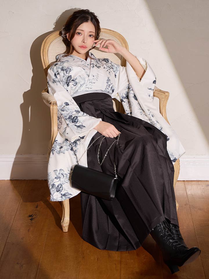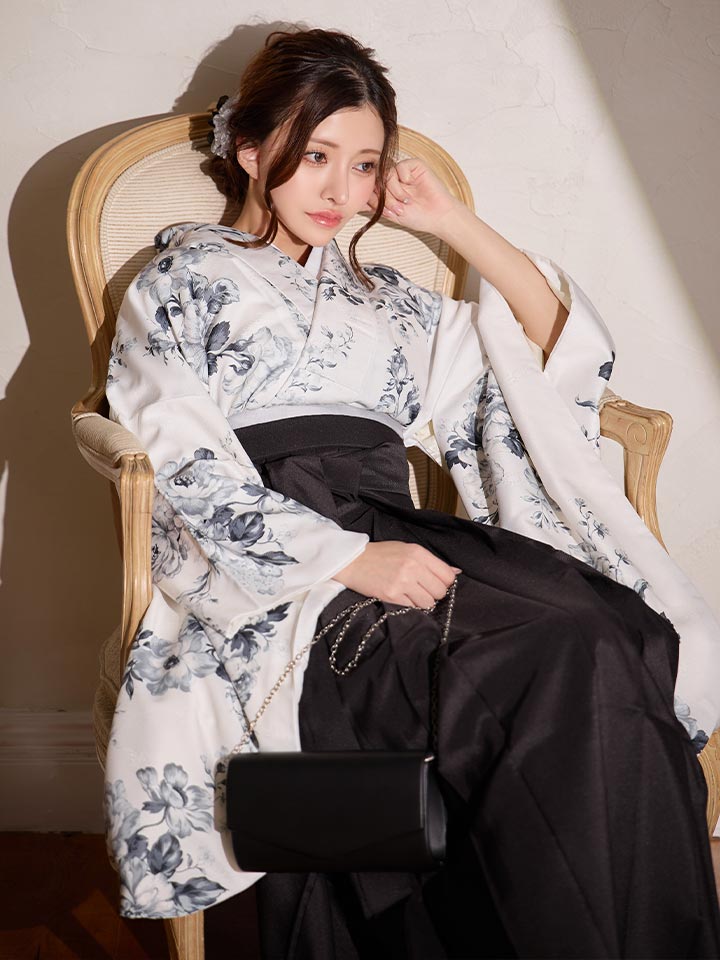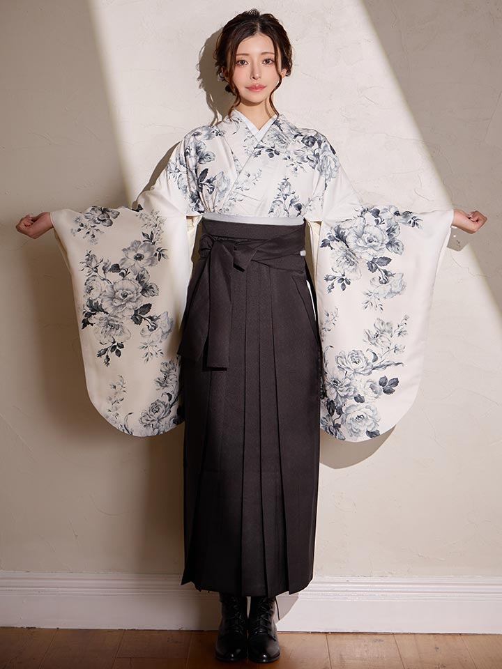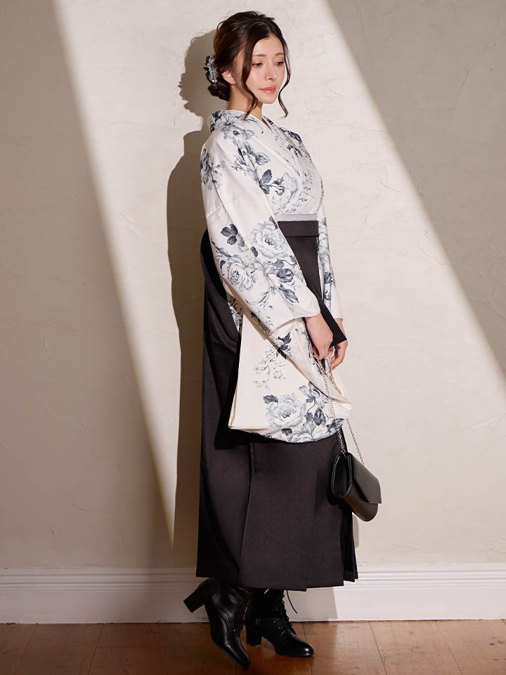 【予約商品 / 1月中旬発送予定】グレーフラワーブーケ ホワイト二尺袖着物【卒業袴3点セット 二尺袖着物/帯/袴】