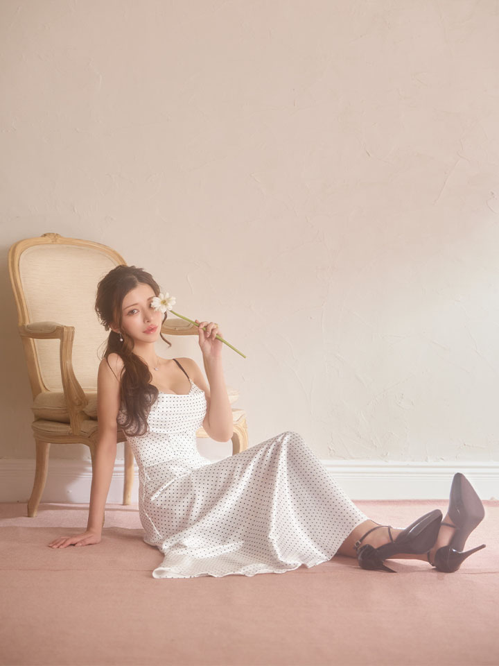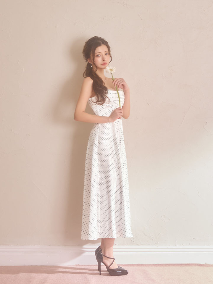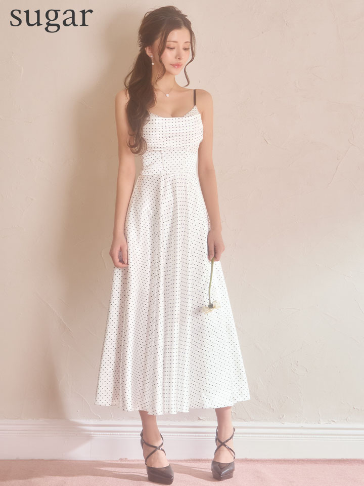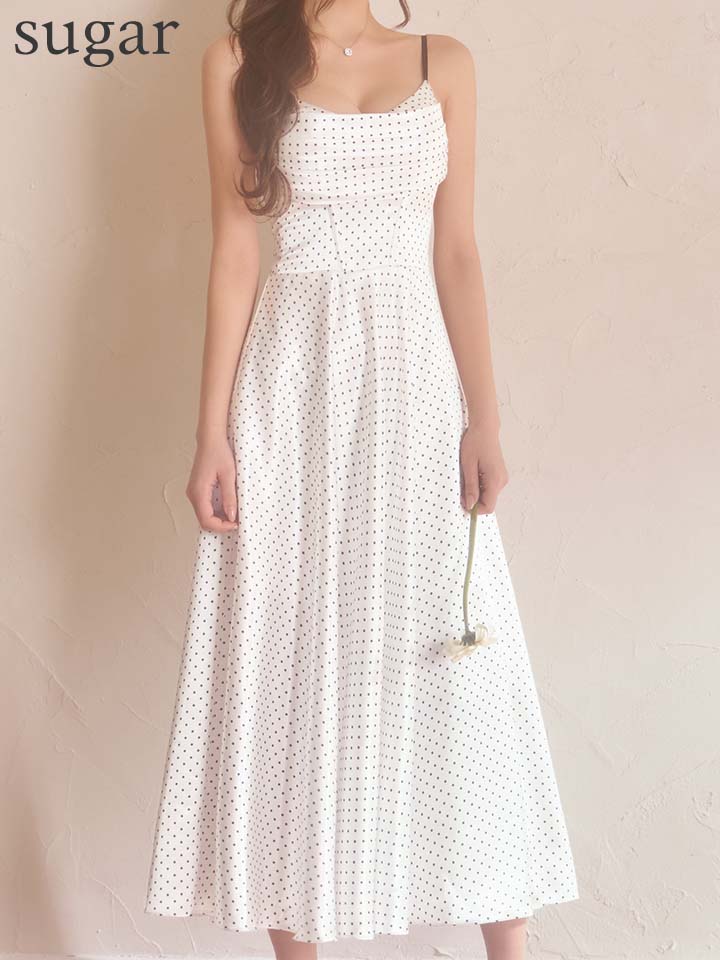 細かなドット柄が全体に広がる、上品でクラシカルなキャミソールドレス。