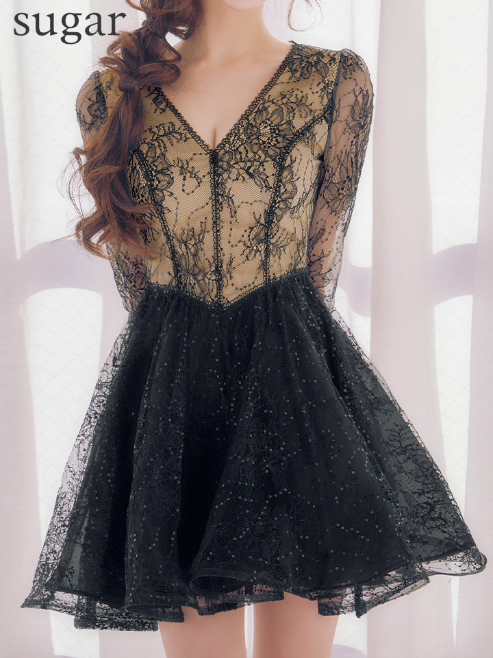 - > XS-Lサイズあり【SETTAN/セッタン】ロングスリーブ/ シースルー/ 刺繍レース/ Vネック/ スパンコール/ チュール/ Aライン/ フレア/ ミニドレス / キャバドレス[OF2]