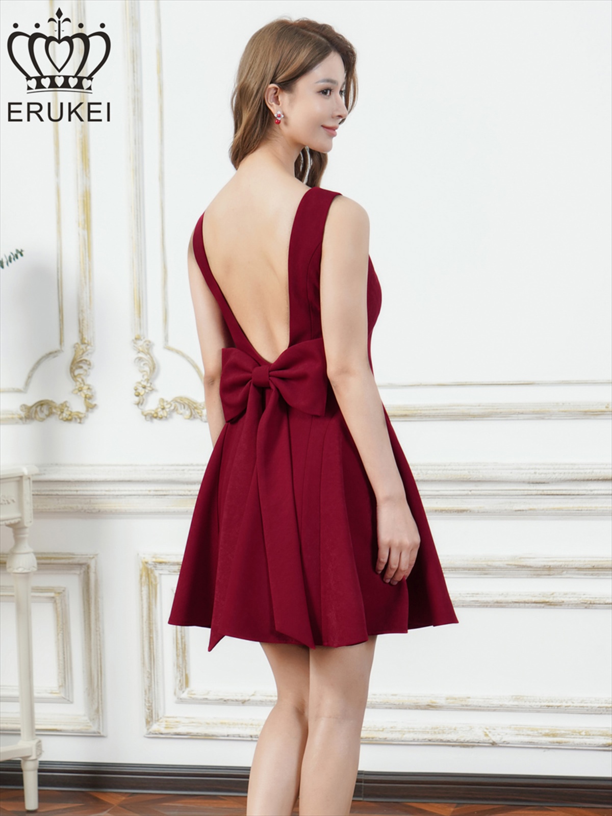 XS-Lサイズあり【ERUKEI エルケイ】バックオープン/ シンプル/ ワンカラー/ リボン/ ボートネック/ Aライン/ フレア/ ミニドレス/ キャバドレス[OF2] [LKE25316-R-2601]