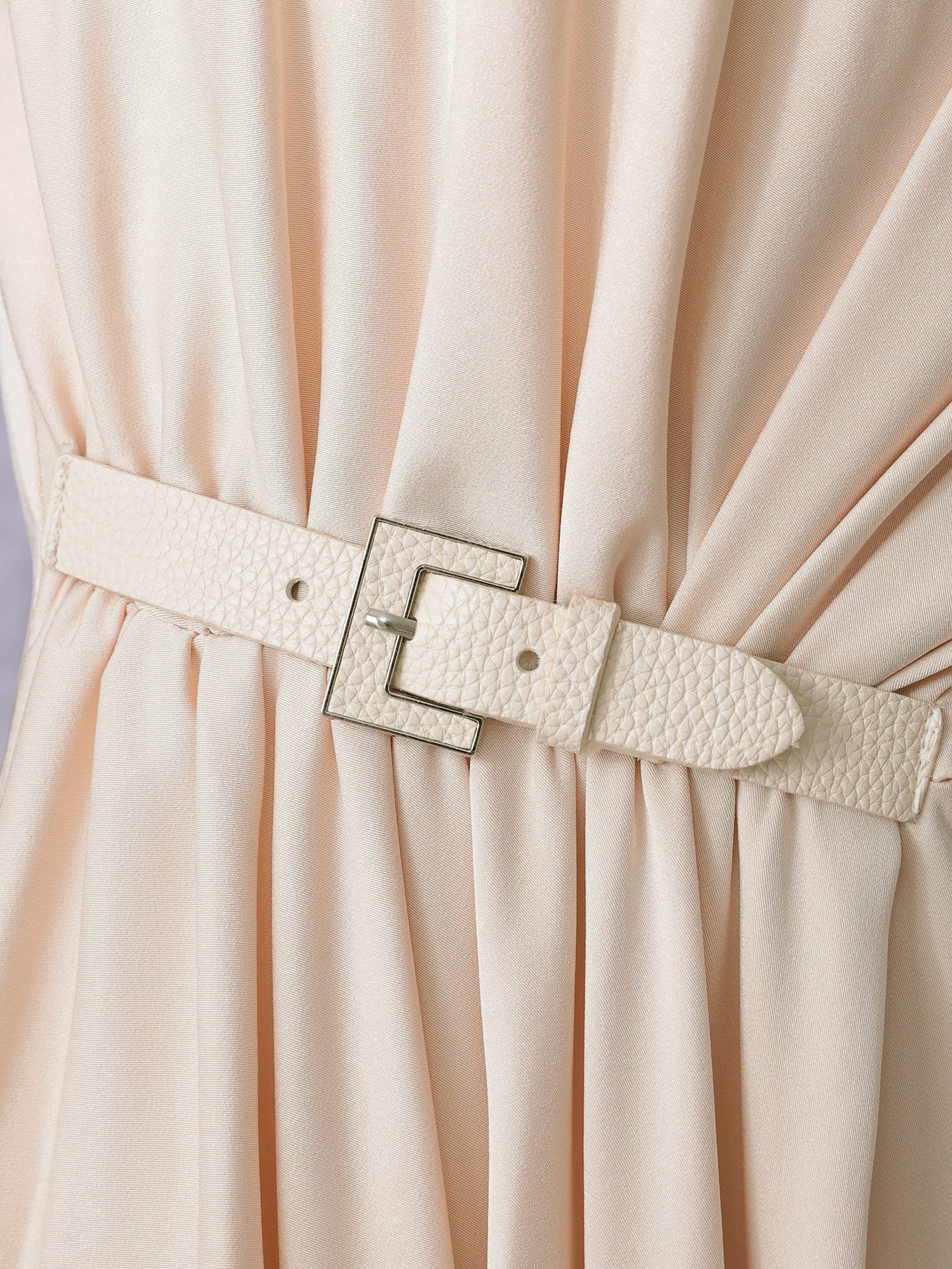 ウエストにはバックル付きベルトを施し、自然なタックでデザイン性とまとまりを持たせています。