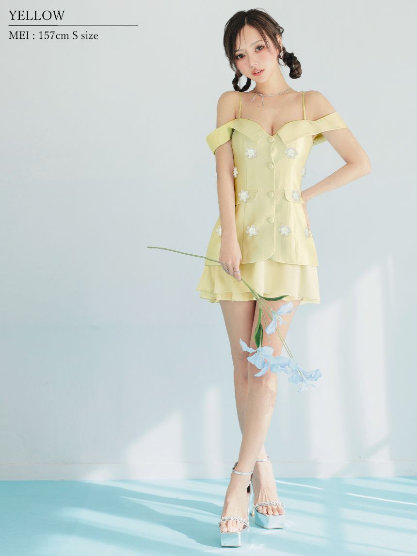 【予約商品/1月上旬-1月中旬発送予定】XSサイズあり【ANGEL R/エンジェルアール】オフショルダー/ ボタン/ ポケット/ フラワー/ シフォン/ フレア/ マイクロミニドレス/ キャバドレス[OF2] [AR26305-Y-S260113]