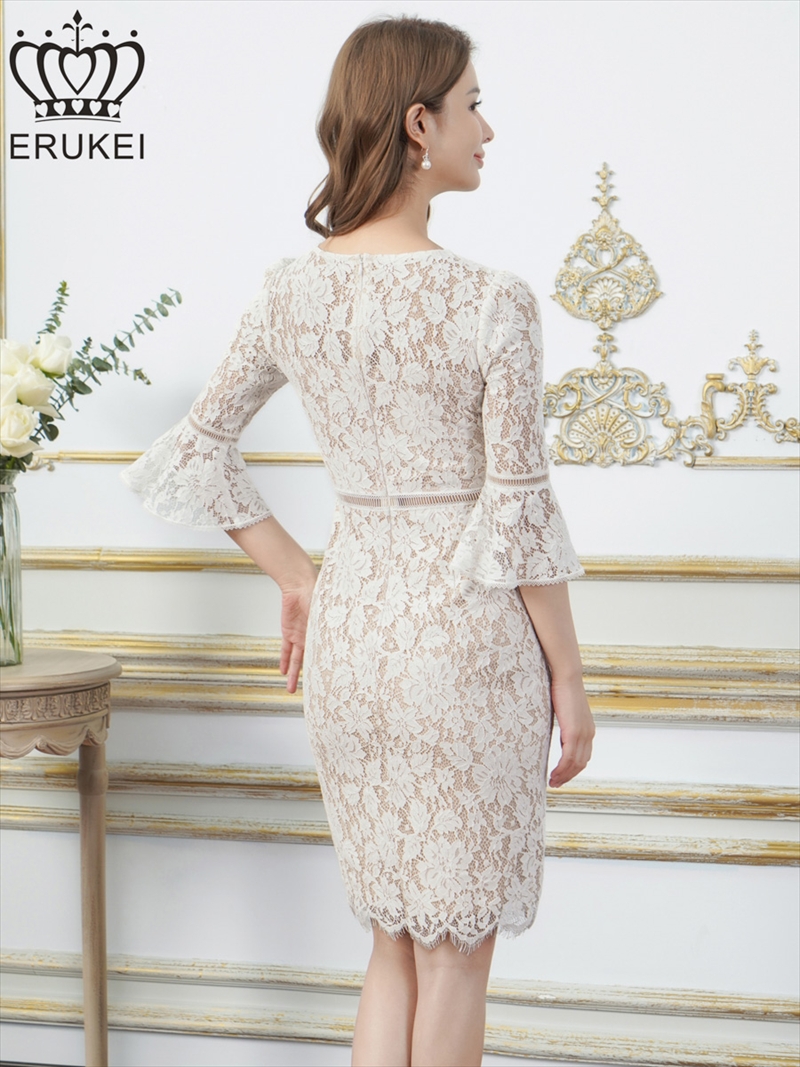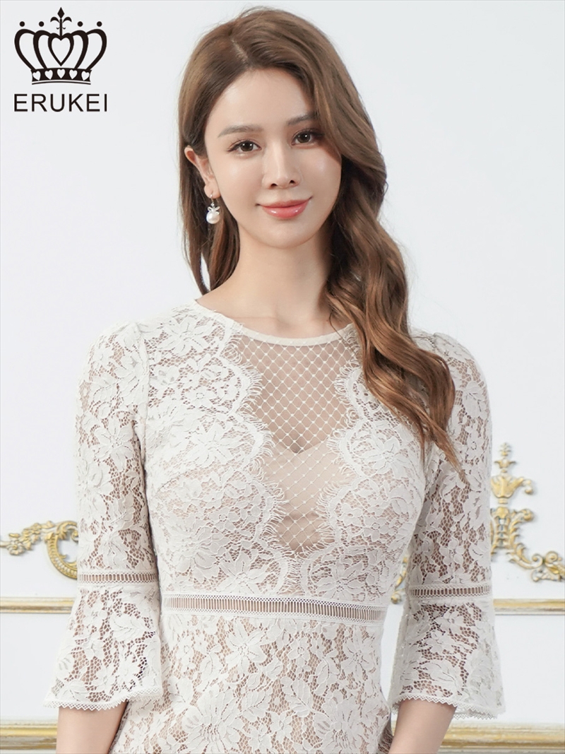 - > XS-Lサイズあり【ERUKEI エルケイ】総レース/ バストシアー/ 七分袖/ 袖あり/ ベルスリーブ/ タイト/ ミディアムドレス/ キャバドレス[OF2]