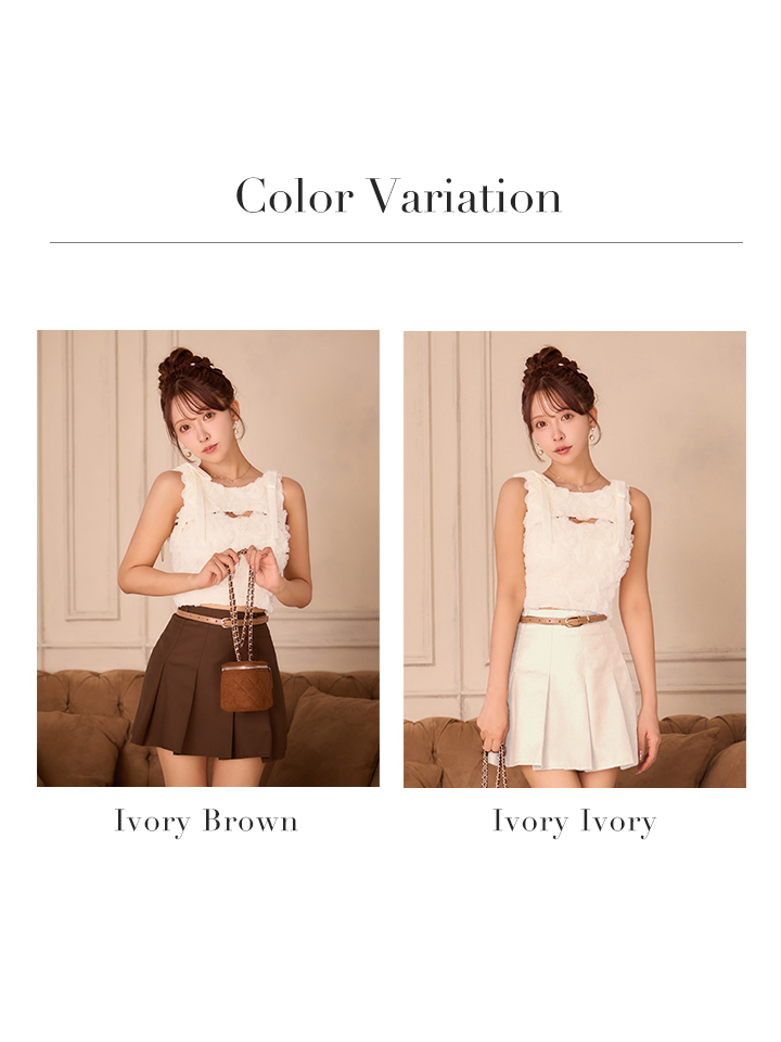 立体的なフラワーレースがフェミニンで華やかなセットアップ。