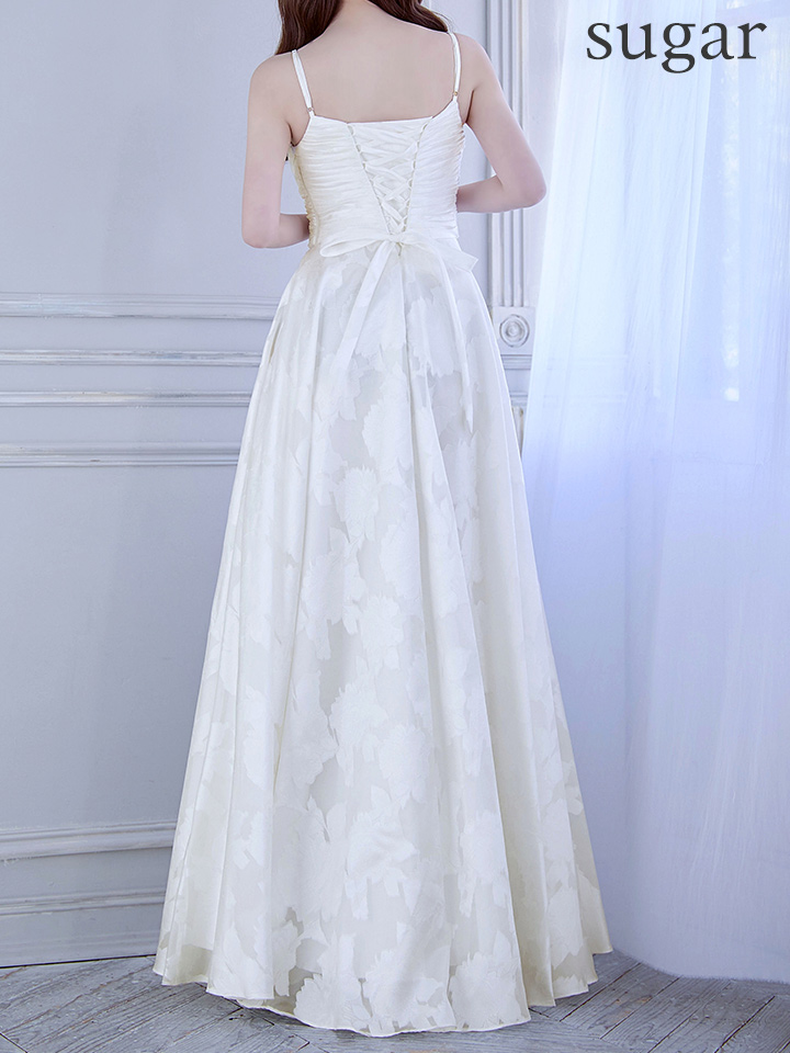 タックデザインとバックスピンドルでボディラインを強調し、ふんわりAラインスカートが360度美しいシルエットを演出◎
