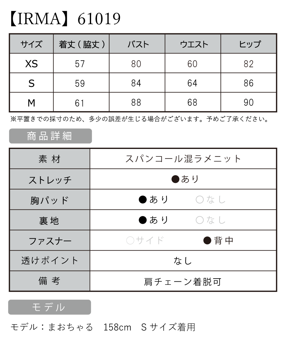 B:88 / W:68 / H:90 [着丈](脇下):約61cm |