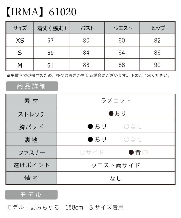 B:88 / W:68 / H:90 [着丈](脇下):約61cm |