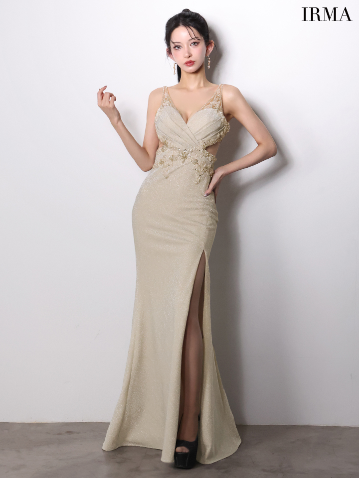 【予約商品/1月下旬発送予定】【IRMA/イルマ】ビジュー/ 刺繍レース/ ウエストシアー/ ラメニット/ バストクロス/ Vネック/ スリット/ ロングドレス/ キャバドレス long[OF2A]