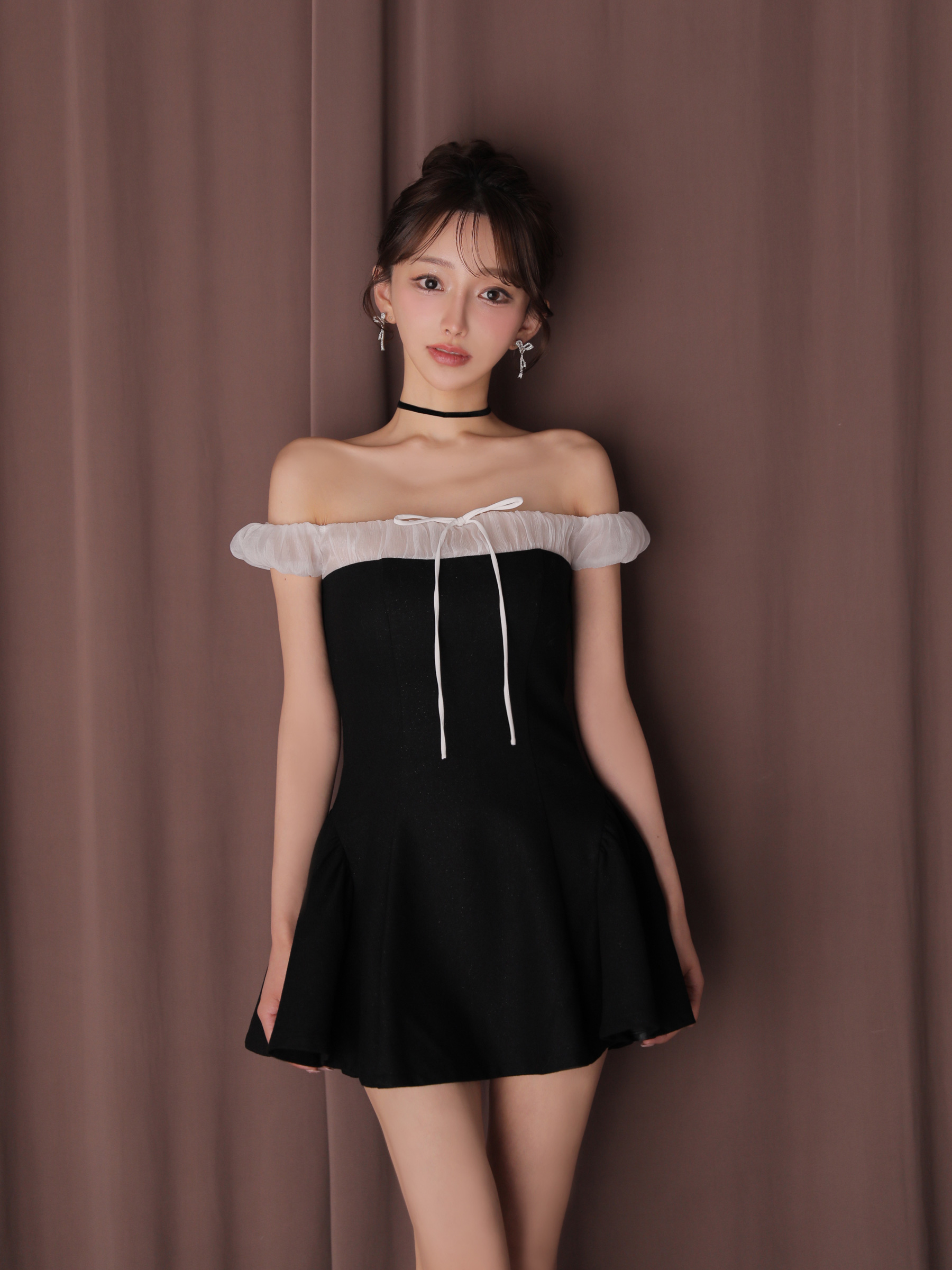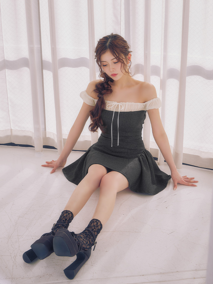 胸元のシフォン素材でフレンチガーリーなオフショルワンピースに仕上げました。