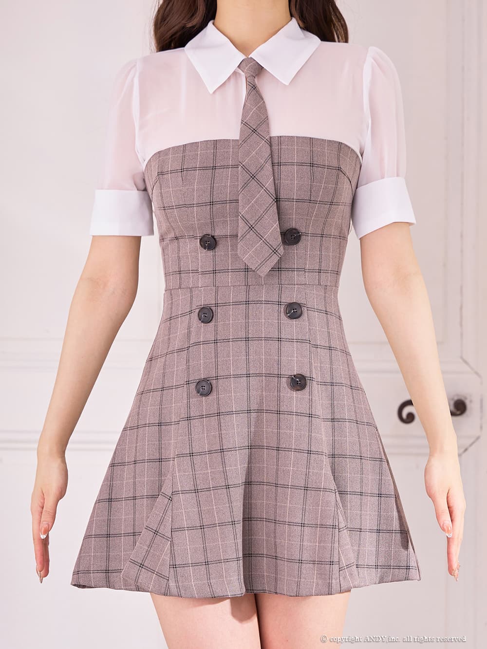 XSサイズあり【an/アン】チェック柄/ レイヤード風/ シャツ/ ネクタイ付き/ ハーフスリーブ/ フレア/ ミニドレス/ キャバドレス[OF05] [AOC4048-BR-2601]