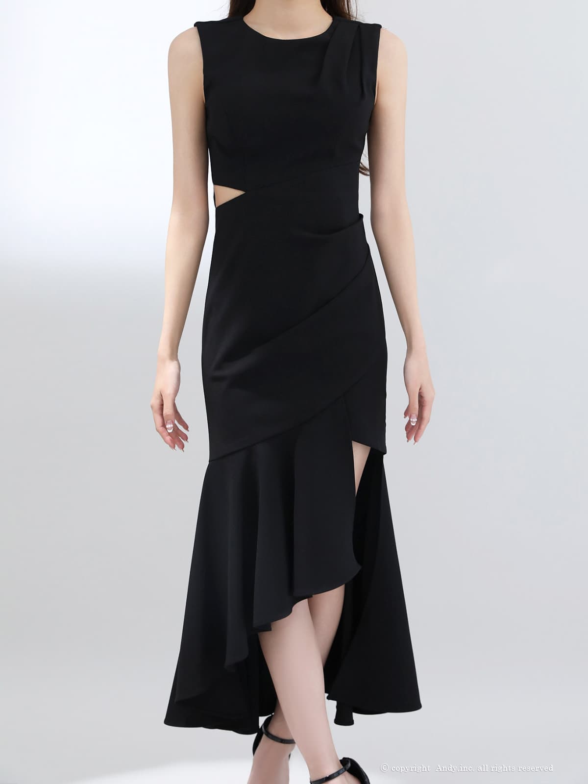 【ANDY/アンディ】ウエストカット/ アシンメトリー/ ノースリーブ / フリル/ テールカット/タック/ ミディアムドレス/ キャバドレス[OF05] [ON3035-B-S260123]