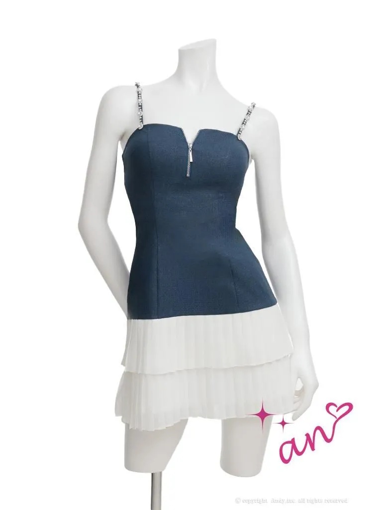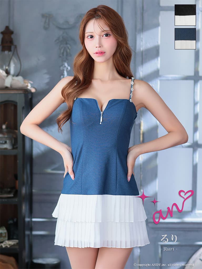 XSサイズあり【an/アン】キャミソール/ ビジューストラップ/ バストジップ/ ティアード/ プリーツ/ フレア/ ミニドレス/ キャバドレス[OF05] [AOC4053-BxW-2601]