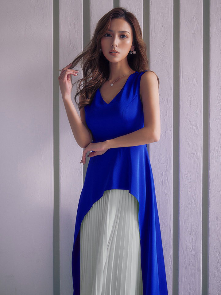 XS-Lサイズあり 【GINZA COUTURE/銀座クチュール】バイカラー/ ノースリーブ/ Vネック/ レイヤード/ プリーツ/ ベルト付き/ Aライン/ 膝丈/ ワンピース/ ミディアムドレス/ キャバドレス[OF2] [LKC25096-RBLxW-S260123]