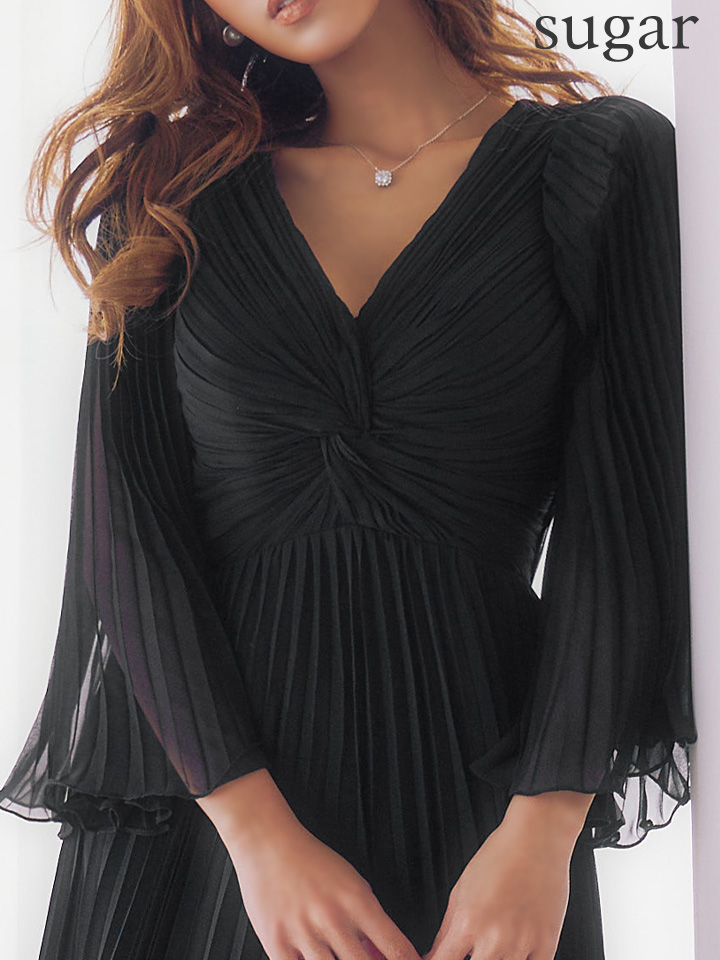 【予約商品/1月下旬発送予定】Lサイズあり【JEAN MACLEAN/ジャンマクレーン】シフォン/ プリーツ/ ロングスリーブ/ シアー/ フレア/ ロングドレス/ キャバドレス long[OF2A]