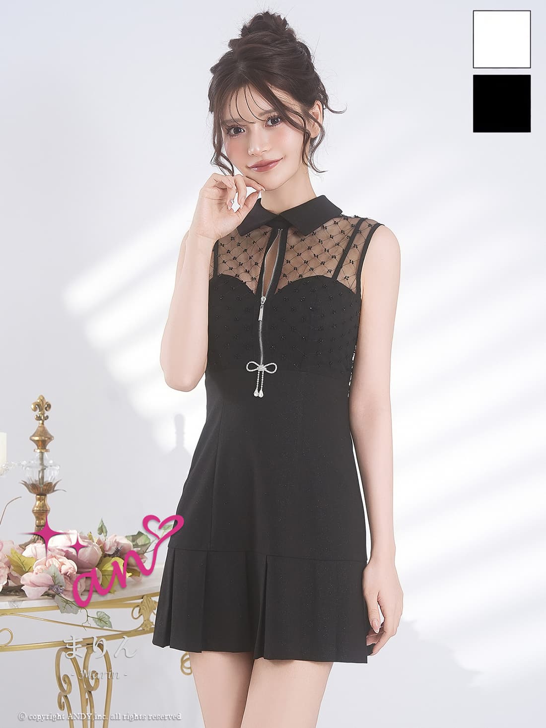 XSサイズあり【an/アン】リボンブローチ/ 襟付き/ バストジップ/ レース/ シアー/ キャミソール/ フレア/ プリーツ/ ミニドレス/ キャバドレス[OF05] [AOC4051-B-2601]