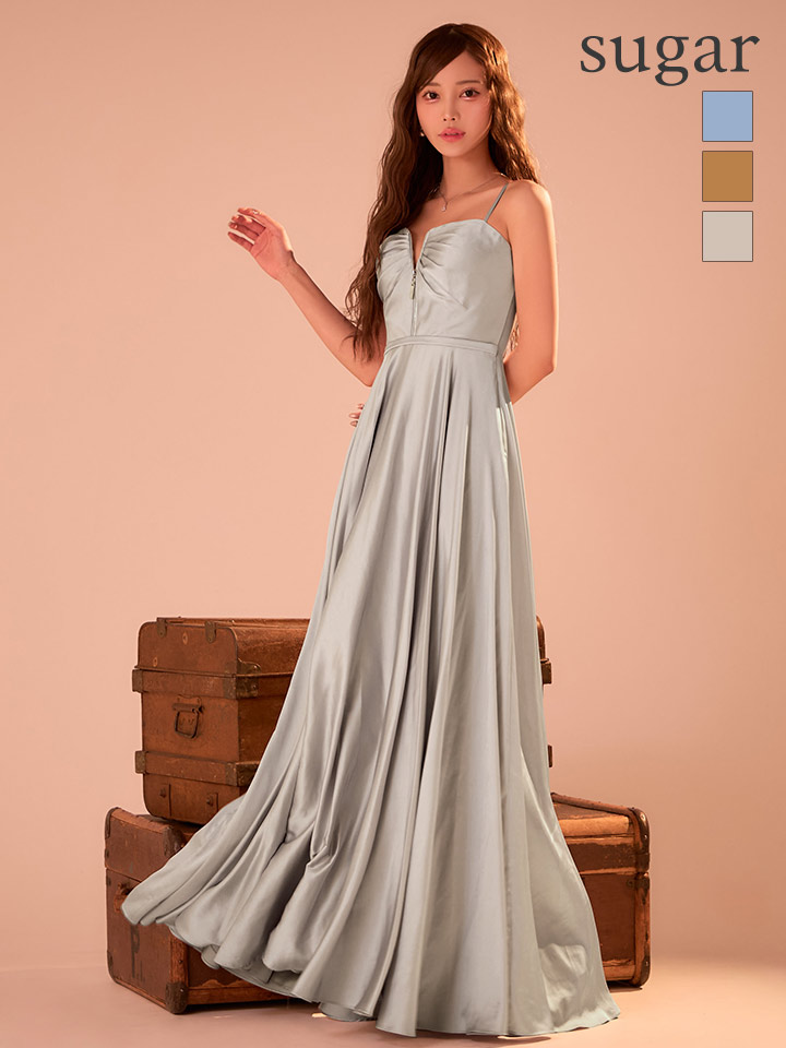 【JEAN MACLEAN/ジャンマクレーン】サテン/ バストジップ/ ギャザー/ キャミソール/ Aライン/ フレア/ ワンピース/ ロングドレス/ キャバドレスlong[OF2A] [51002-JM-earthBL-S260124]