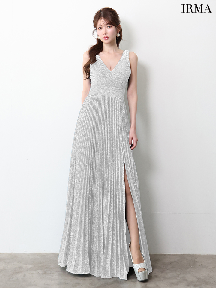 【IRMA/イルマ】プリーツ/ ストレッチ/ ラメニット/ ノースリーブ/ スリット/ フレア/ ロングドレス/ キャバドレス long[OF2A] [61029-IR-CHP-2601]