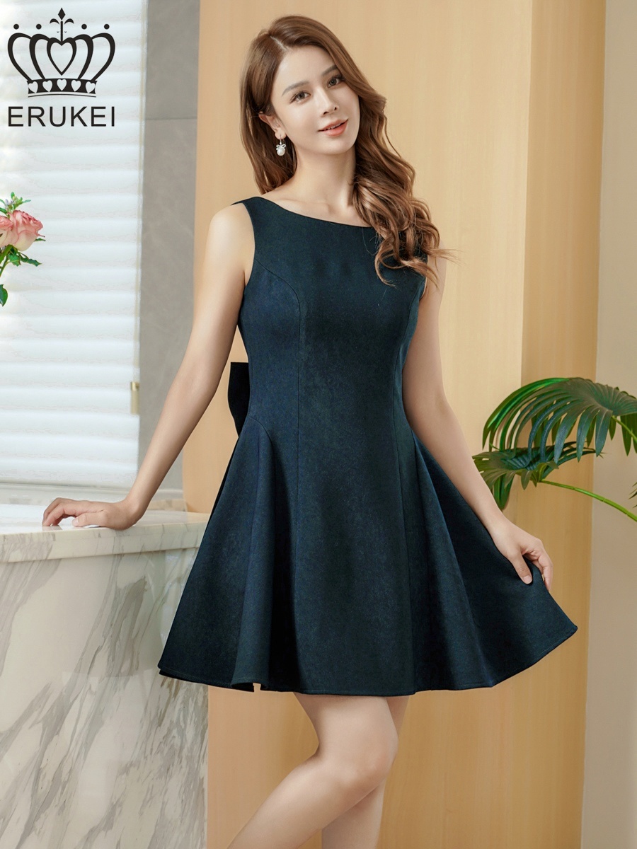XS-Lサイズあり【ERUKEI エルケイ】バックオープン/ シンプル/ ワンカラー/ リボン/ ボートネック/ Aライン/ フレア/ ミニドレス/ キャバドレス[OF2]