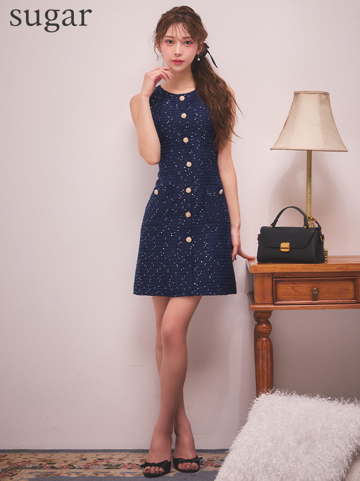 XS-Lサイズあり【GINZA COUTURE/銀座クチュール】ツイード/ スパンコール/ ボタン/ ノースリーブ/ Aライン/ 膝丈/ ワンピース/ ミディアムドレス/ キャバドレス[OF2] [LKC25082-NV-S260127]