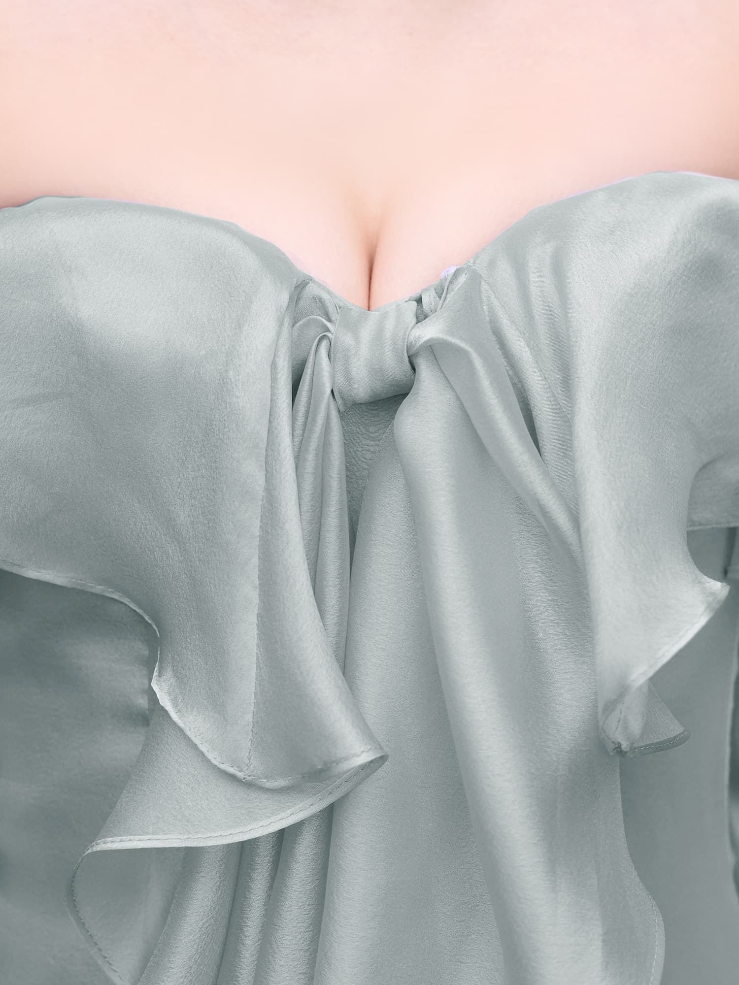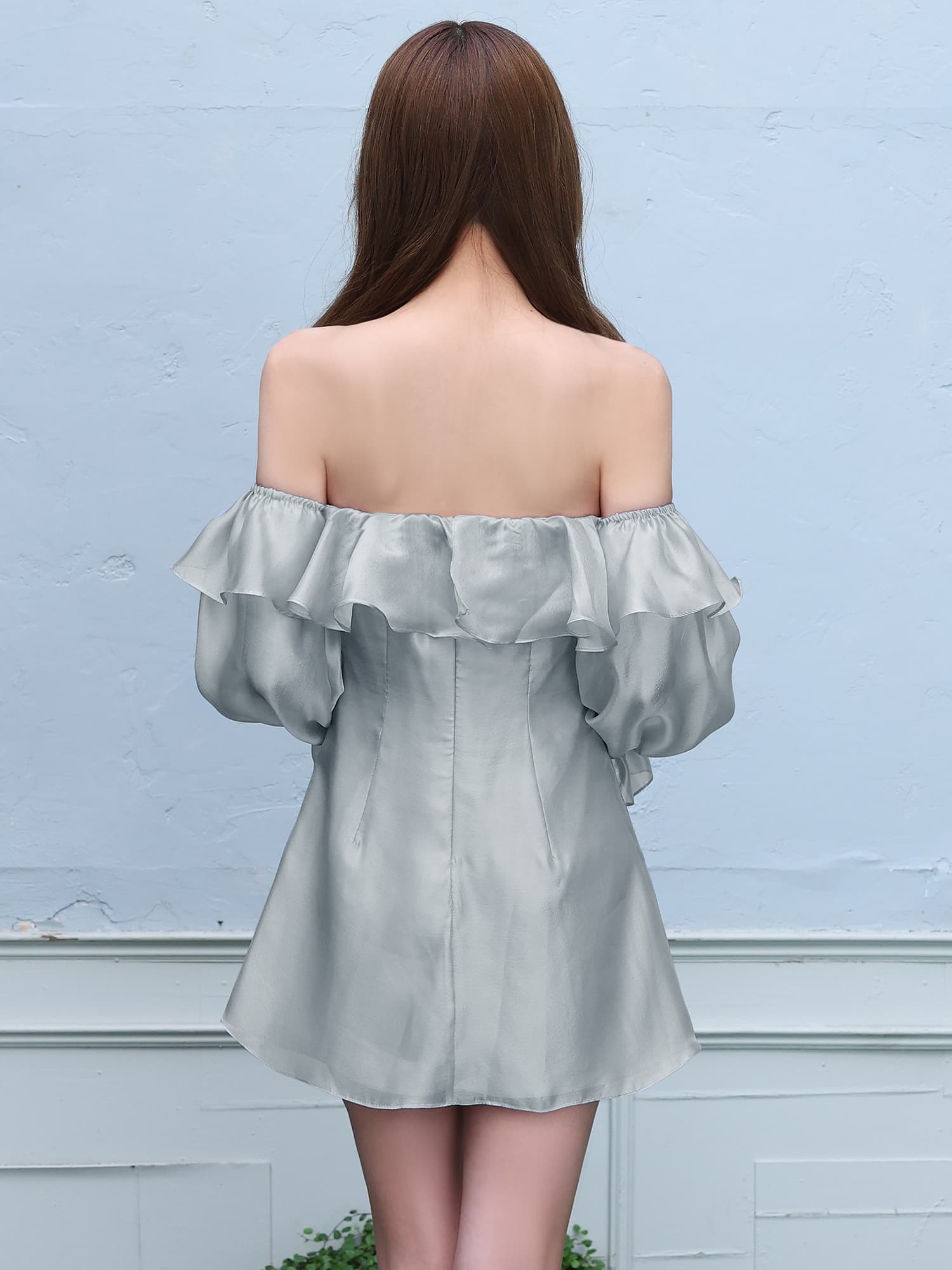デコルテを彩る立体的なフリルデザインが、華やかでフェミニンな印象を演出する一着。