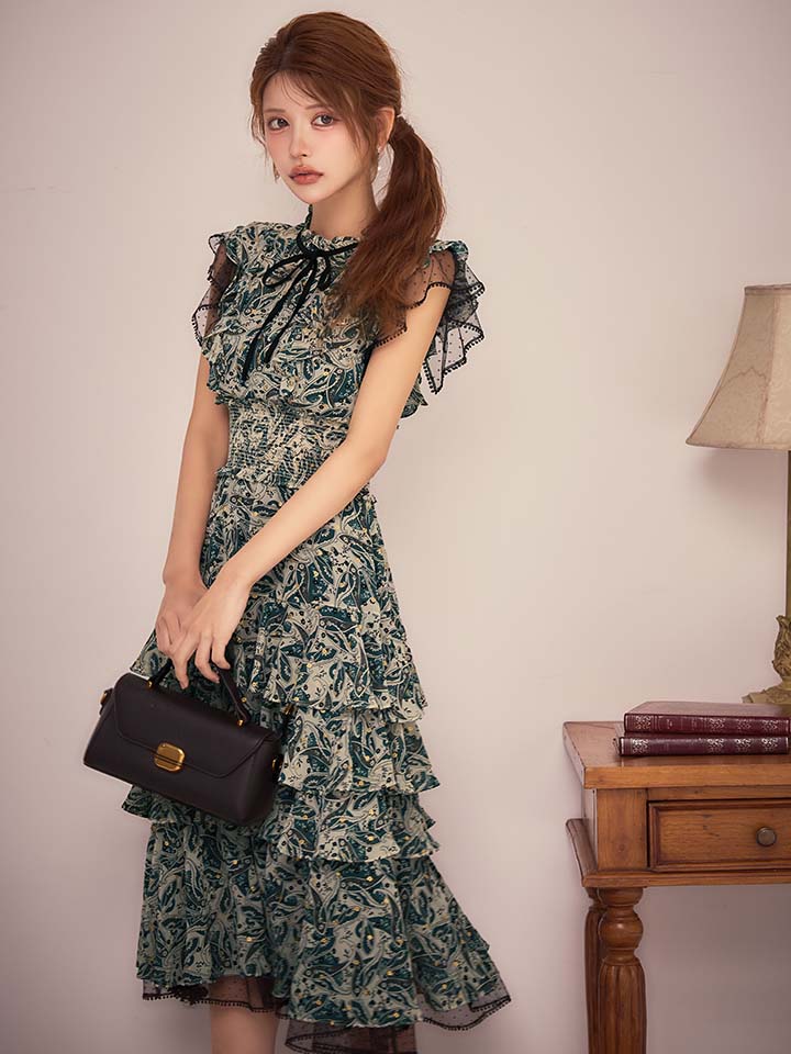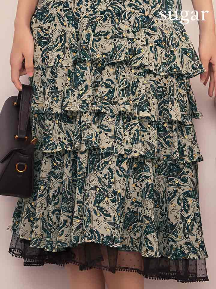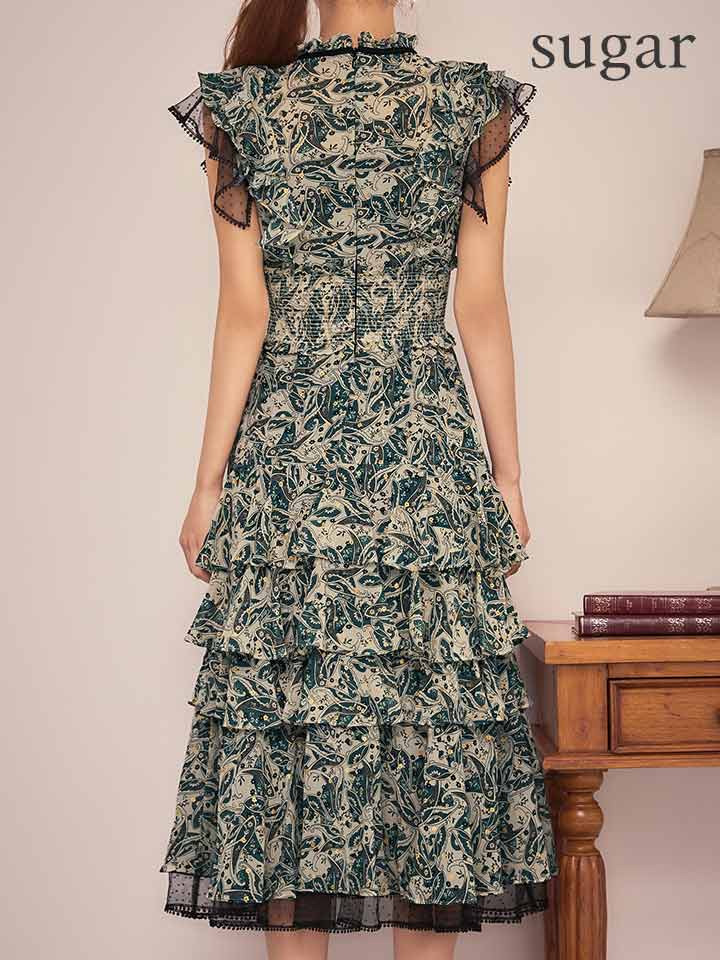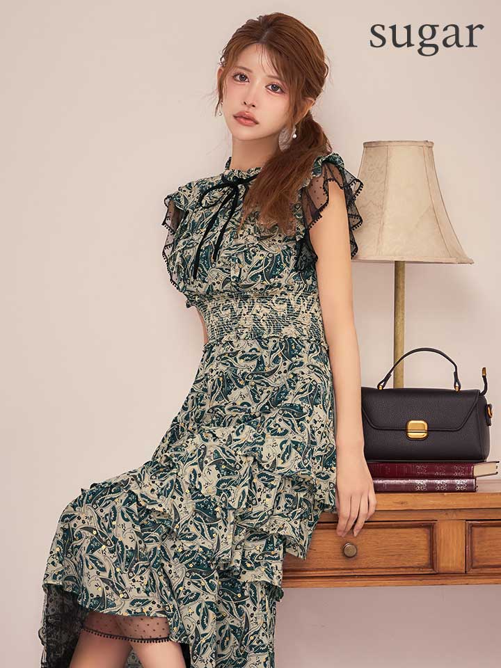 XS-Lサイズあり【SETTAN/セッタン】ペイズリー柄/ シフォン/ フリルスリーブ/ ティアード/ Aライン/ 膝丈/ ワンピース/ ミディアムドレス/ キャバドレス[OF2] [LKS111208-GR-S260127]