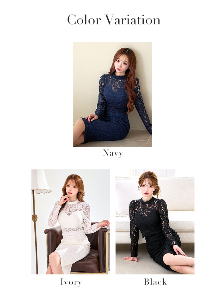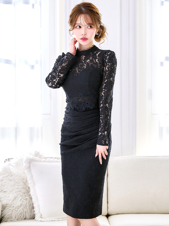 - > Lサイズあり【VANESSA HEART / ヴァネッサハート】【OF05】 総レース/ タック/ ハイネック/ 袖あり/ 長袖/ タイトスリーブ/ 膝丈/ ミディアムドレス/ キャバドレス