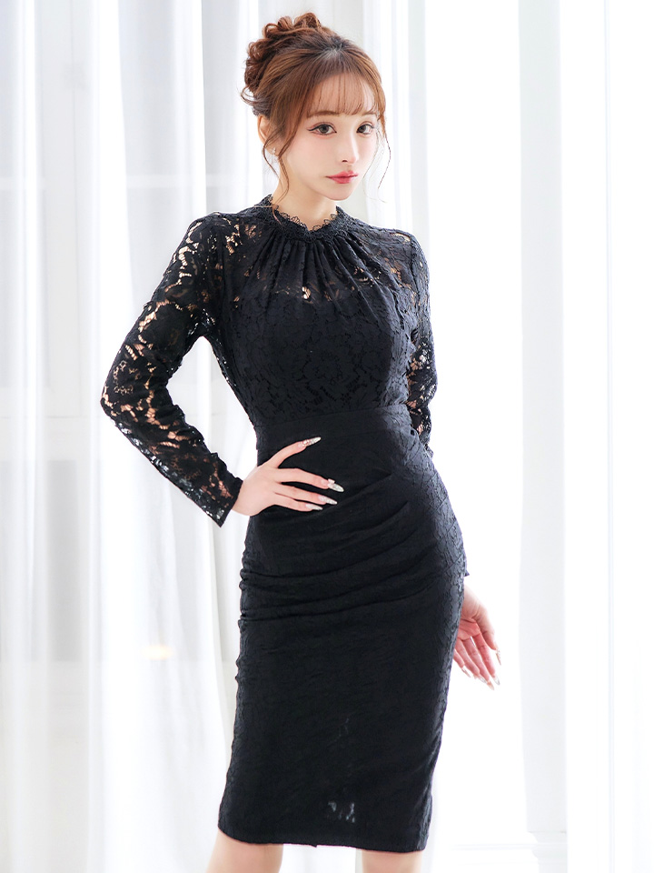 - > Lサイズあり【VANESSA HEART / ヴァネッサハート】【OF05】総レース/ ハイネック/ ロングスリーブ/ 袖あり/ タック/ 膝丈/ タイト/ ミディアムドレス/ キャバドレス