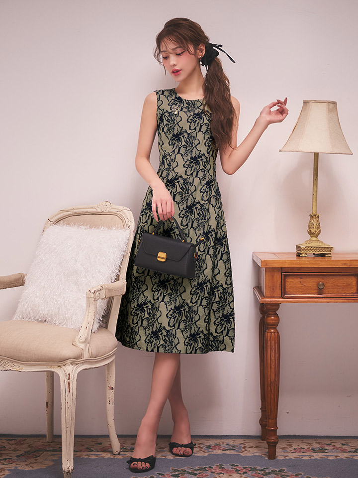 XS-Lサイズあり 【GINZA COUTURE/銀座クチュール】ノースリーブ/ 花柄/ ミモレ丈/ フレア/ ワンピース/ ミディアムドレス/ キャバドレス[OF2] [LKC2941-GR-S260127]