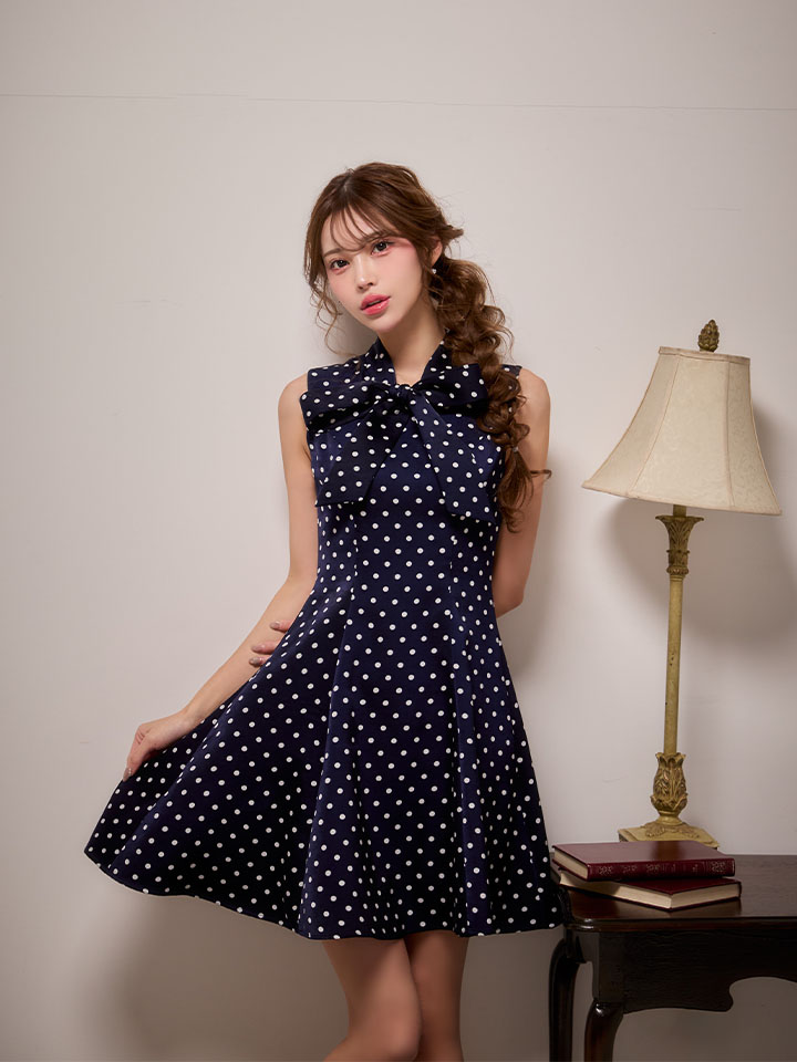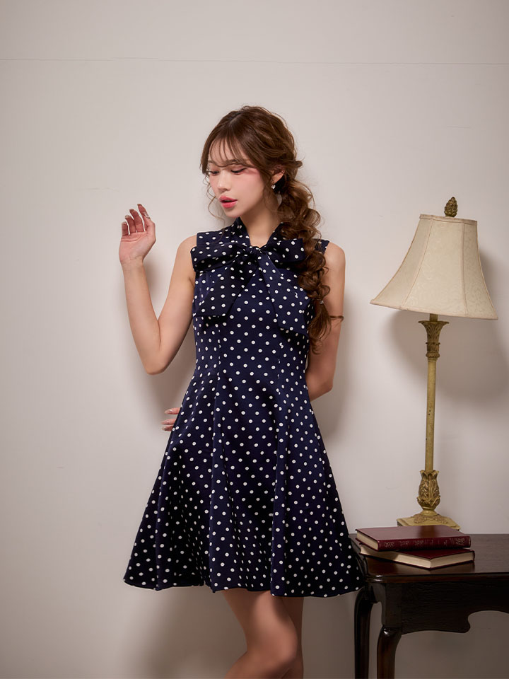 XS-Lサイズあり【ERUKEI エルケイ】ドット/ ノースリーブ/ プチハイネック/ リボン/ Aライン/ ワンピース/ ミニドレス/ キャバドレス[OF2] [LKE25038-NVxW-S260127]