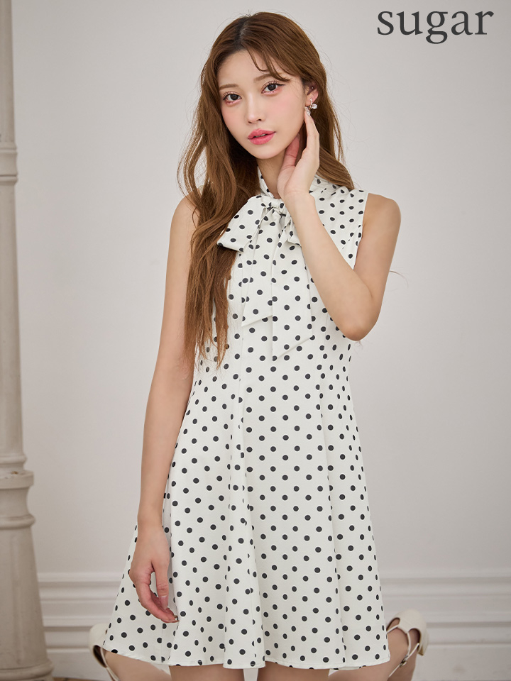 - > XS-Lサイズあり【ERUKEI エルケイ】ドット/ ノースリーブ/ プチハイネック/ リボン/ Aライン/ ワンピース/ ミニドレス/ キャバドレス[OF2]