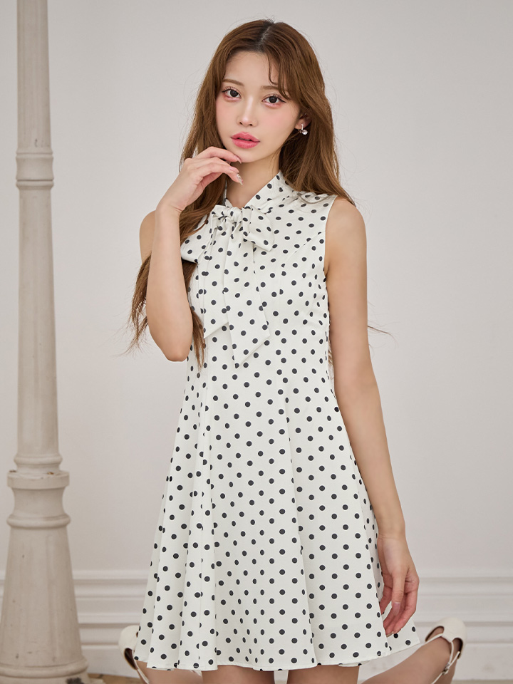 XS-Lサイズあり【ERUKEI エルケイ】ドット/ ノースリーブ/ プチハイネック/ リボン/ Aライン/ ワンピース/ ミニドレス/ キャバドレス[OF2] [LKE25038-IVxB-S260128]
