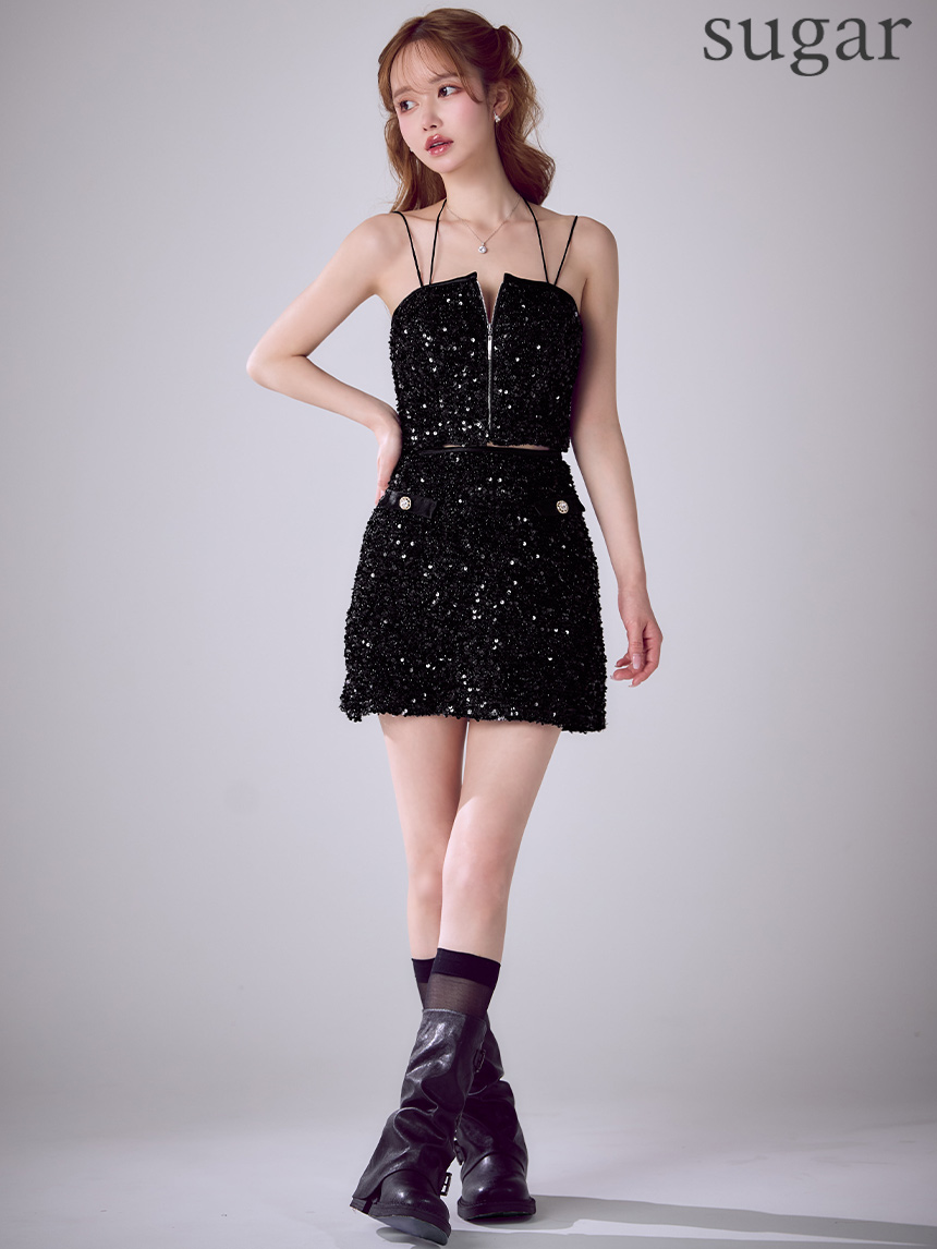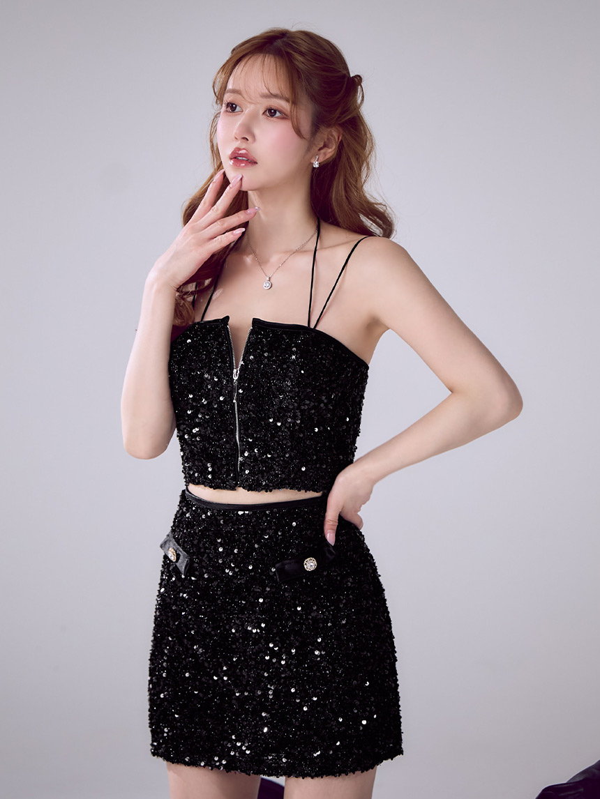 - > XSサイズあり【IRMA/イルマ】スパンコール/ セットアップ/ バストジップ/ キャミソール/ ビジューボタン/ タイト/ ミニドレス/ キャバドレス[OF2A]