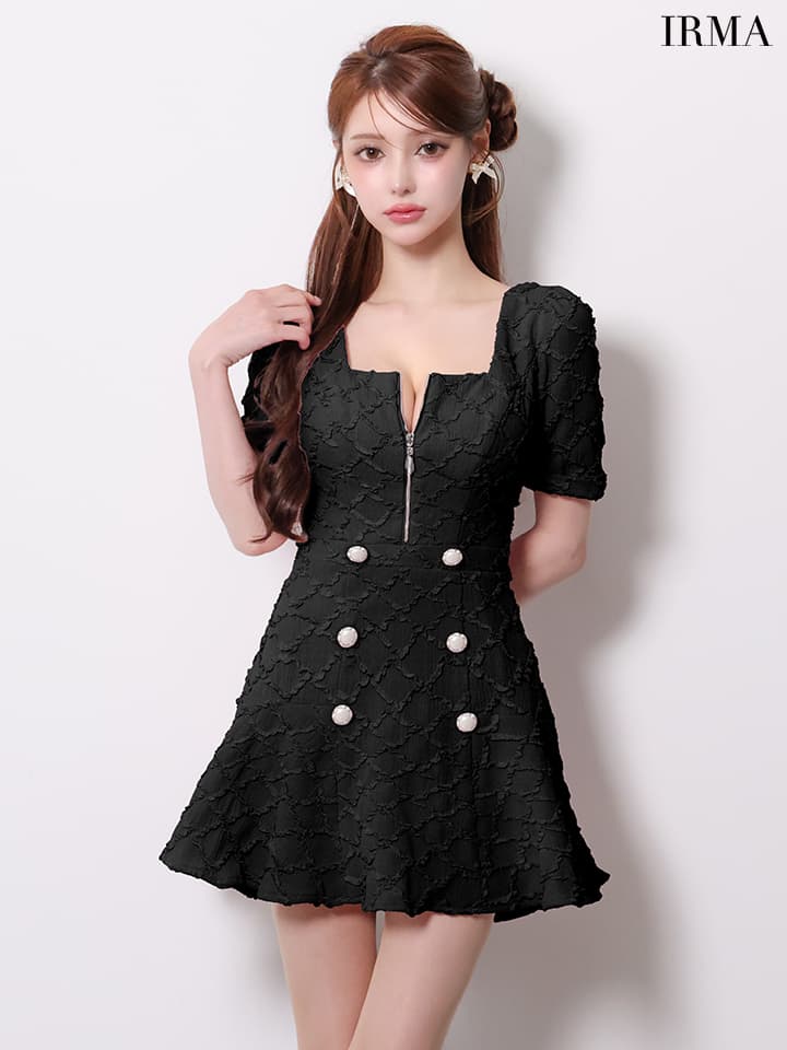 XSサイズあり【IRMA/イルマ】ダイヤ柄/ ジャガード/ 袖あり/ スクエアネック/ パールボタン/ 半袖/ ハイウエスト/ フレア/ ミニドレス/ キャバドレス[OF2A] [61018-IR-B-2601]