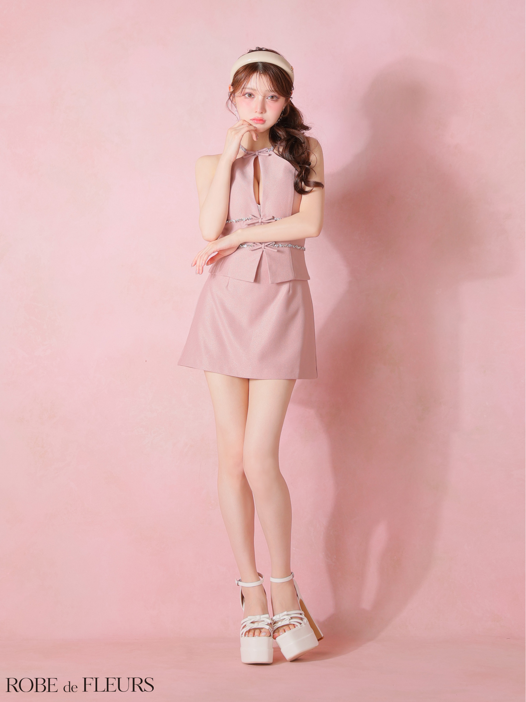 【予約商品/1月下旬発送予定】XSサイズあり【ROBE de FLEURS/ローブドフルール】ラメ/ ツイル/ ビジュー/ リボン/ ホルターネック/ セットアップ/ ミニドレス/ キャバドレス[OF08] [FM4343-P-S260128]